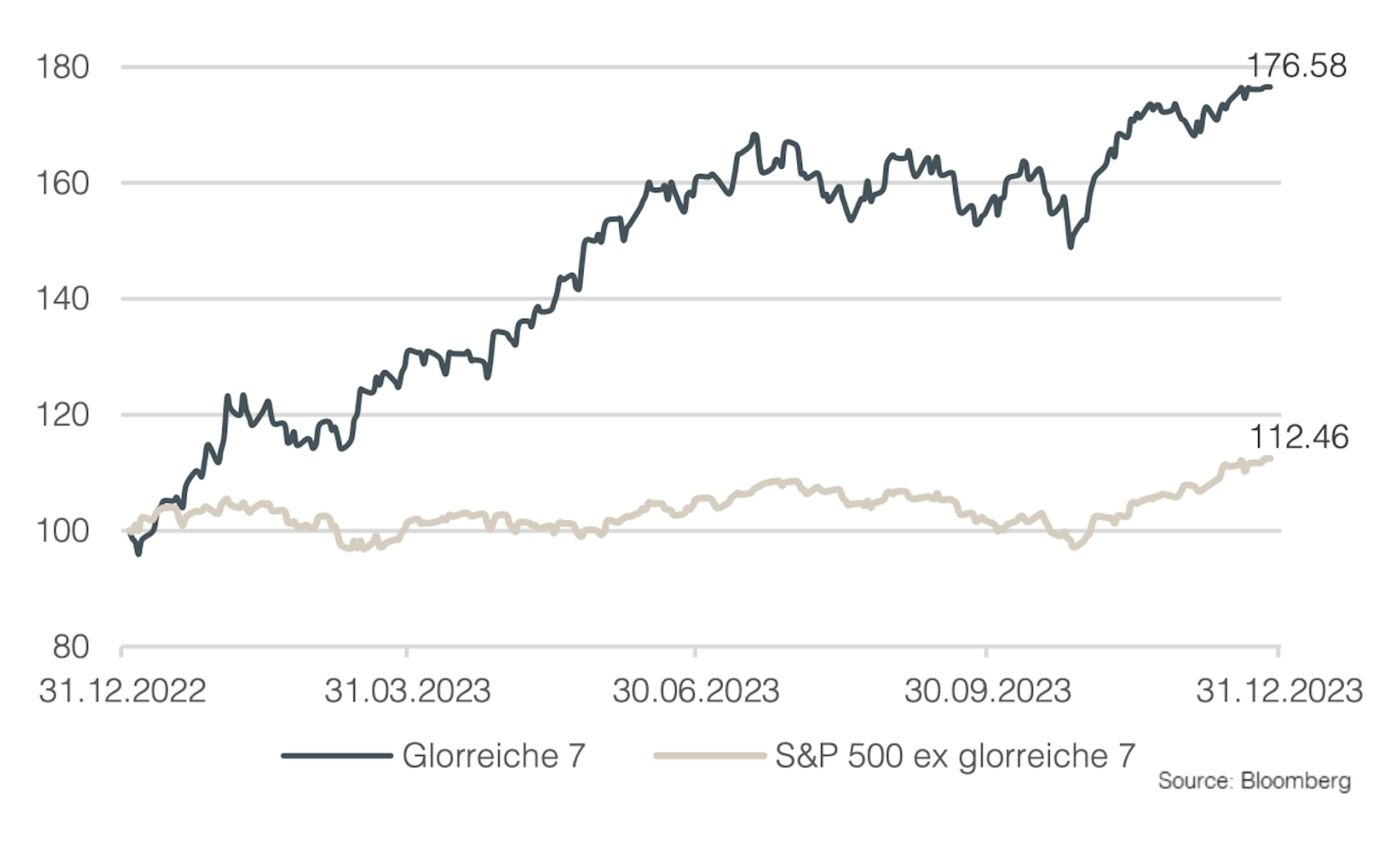 In den vergangenen zwei Jahren haben wir wiederholt berichtet, wie die Entwicklung der globalen Aktienmärkte maßgeblich von einer Handvoll US-Technologiewerten beeinflusst wurde. Auch im Jahr 2023 waren es erneut dieselben Unternehmen, die den Gesamtmarkt dominierten. Auffällig ist, dass die Vorherrschaft dieser sieben marktführenden Unternehmen (Alphabet, Amazon, Apple, Meta, Microsoft, NVIDIA und Tesla) sogar zugenommen hat und dadurch Marktverzerrungen entstanden, die unsere Aufmerksamkeit verdienen. Der Begriff "die glorreichen Sieben", in Anlehnung an den Filmklassiker aus den 60er Jahren, hat sich bei den Anlegern bereits als Bezeichnung für diese marktprägenden Titel etabliert. Seit dem vergangenen Jahr gibt es sogar einen börsengehandelten Fonds, der ausschließlich die Rendite dieser Titel abbildet. Für aktive Anleger war dieses Phänomen wohl die größte Herausforderung im vergangenen Anlagejahr.