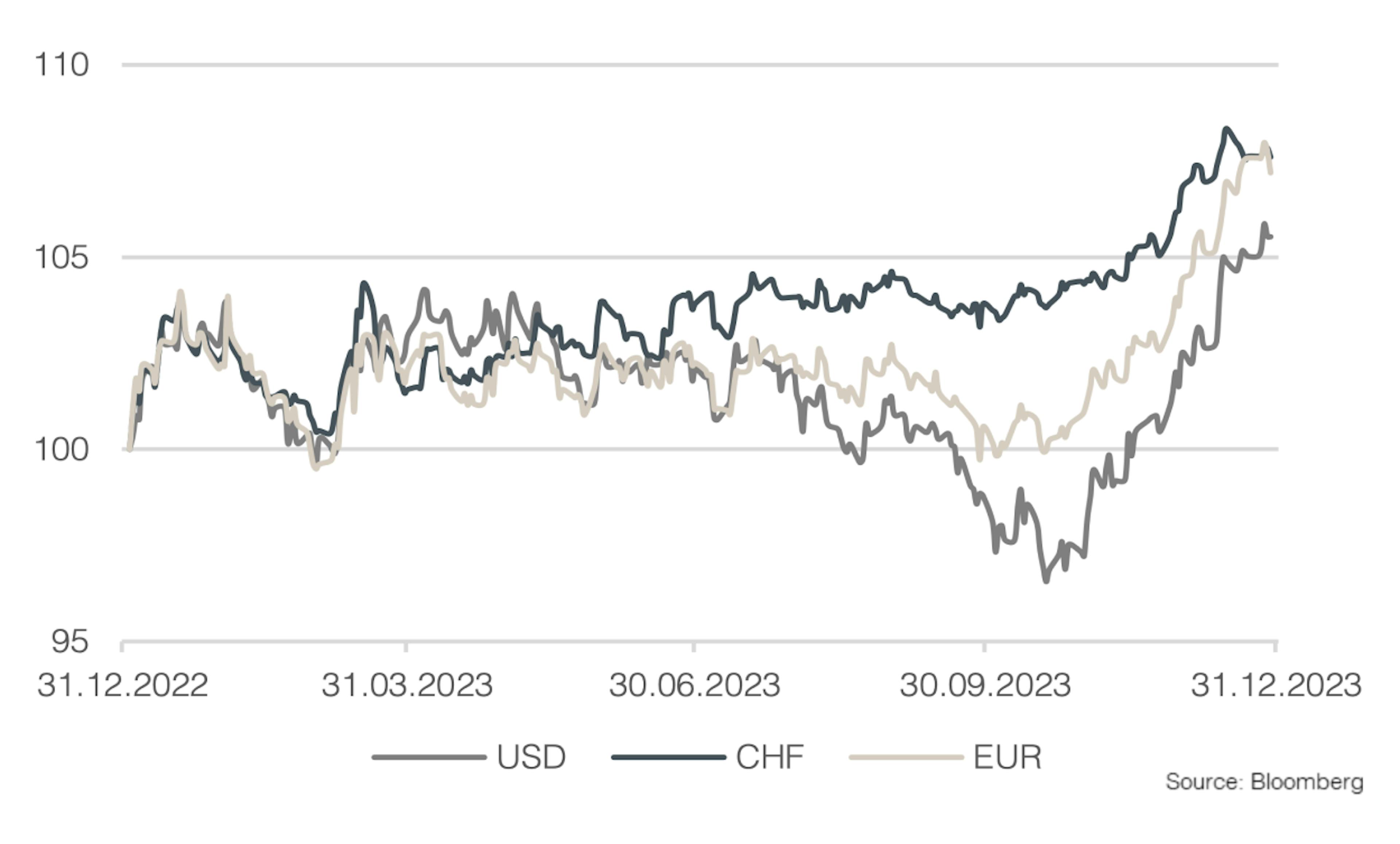 Was sich zum Jahresende als gute Strategie erwies, brauchte im Verlauf des Jahres viel Nerven. Mit Ausnahme von CHF-Anleihen, die bereits im Jahr 2022 ihren Zinshöhepunkt erreichten, verzeichneten vor allem USD-Anleihen aufgrund des unerwartet starken Zinsanstiegs bis Oktober Kursverluste. Die untenstehende Grafik, die den aggregierten Bondmarkt nach Währung zeigt, verdeutlicht, wie der Grossteil der Kursgewinne bei den Anleihen erst zum Ende des Jahres erzielt wurden. Dies war vor allem auf die Federal Reserve zurückzuführen, die gegen Ende des Jahres erstmals signalisierte, dass der Kampf gegen die Inflation erfolgreich verlaufe und keine weiteren Zinsschritte zu erwarten seien.