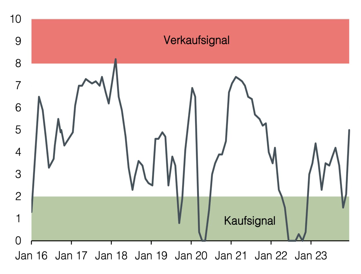 Auch Sound Capital startete das Jahr mit einer defensiven Aktienpositionierung. Obwohl der Aktienmarkt fulminant ins Jahr startete, zeigten sich unter der Oberfläche starke Divergenzen. Während die glorreichen Sieben per Ende Oktober über 50 % zulegten, notierten zum gleichen Zeitpunkt die Indizes für klein- und mittelkapitalisierte Unternehmen auf globaler Ebene im negativen Bereich. Entsprechend groß waren zu diesem Zeitpunkt die Bewertungsdifferenzen. Das zu diesem Zeitpunkt negative Anlegersentiment veranlasste uns per Ende Oktober, die Aktiengewichtung auf neutral zu erhöhen. Was sich im Nachhinein als gutes Timing erwies, reichte für das Gesamtjahr jedoch nicht aus, um das Untergewicht vom Jahresbeginn vollständig zu kompensieren.