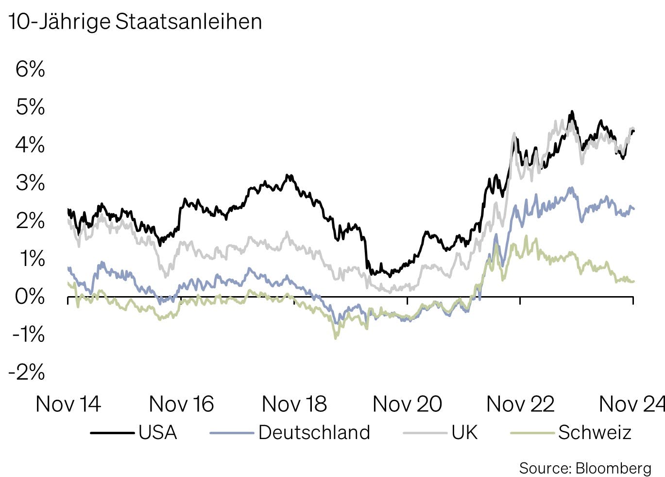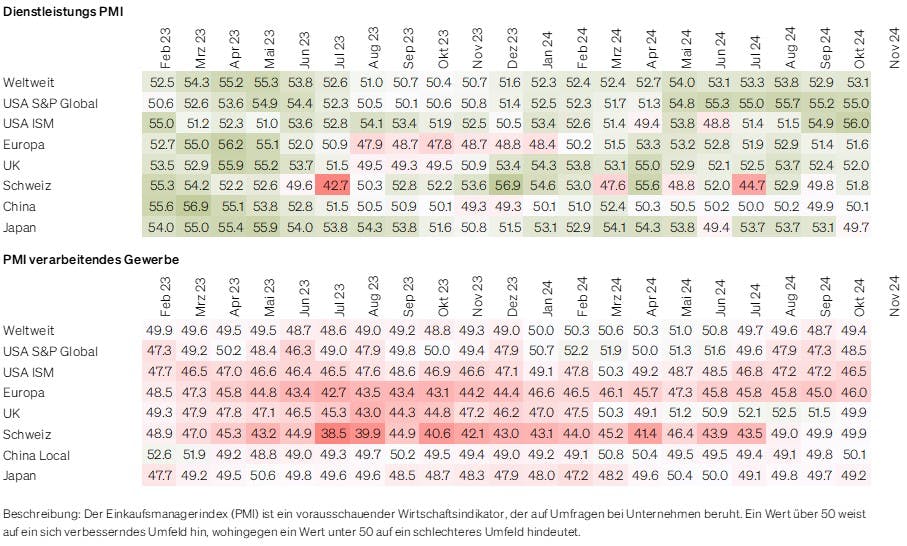 Da Trumps Steuer- und Zollpolitik wohl erst im zweiten Halbjahr 2025 oder Anfang 2026 greift, dürften mittelfristig eher die wirtschaftlichen Fundamentaldaten die Marktentwicklung bestimmen. Eine sanfte Landung der US-Wirtschaft bleibt für uns deshalb ein wahrscheinliches Szenario, welches es den Zentralbanken ermöglichen dürfte, die Zinsen weiter zu senken. Angesichts der bereits hohen Bewertungen und ambitionierten Gewinnerwartungen für 2025 bleiben wir dennoch bei einer neutralen Aktienpositionierung. Aufgrund eines eher trüben Ausblicks für Unternehmen im Basiskonsumgütersektor in der aktuellen Berichtssaison reduzieren wir unser Übergewicht auf ein neutrales Niveau. Im Anleihenbereich vermeiden wir weiterhin Kreditrisiken, da die Risikoaufschläge nach den US-Wahlen auf Rekordtiefststände gefallen sind.
