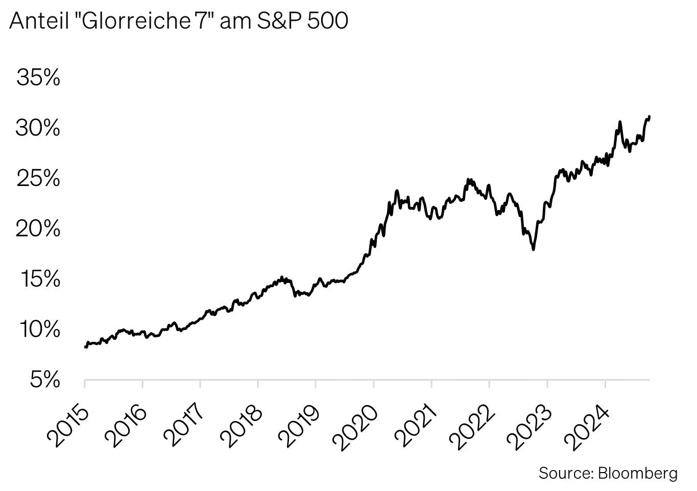 Ein wiederkehrender Trend war die Dominanz der grossen Wachstumswerte. Die bereits erwähnten «glorreichen Sieben» hatten zum Jahresende eine Gewichtung von über 30% im S&P 500 – eine bemerkenswerte Konzentration, wenn man bedenkt, dass diese Zahl vor zehn Jahren noch nicht einmal zweistellig war. Damit gehen erhebliche Konzentrationsrisiken einher, die die Märkte in Zukunft beeinflussen könnten.