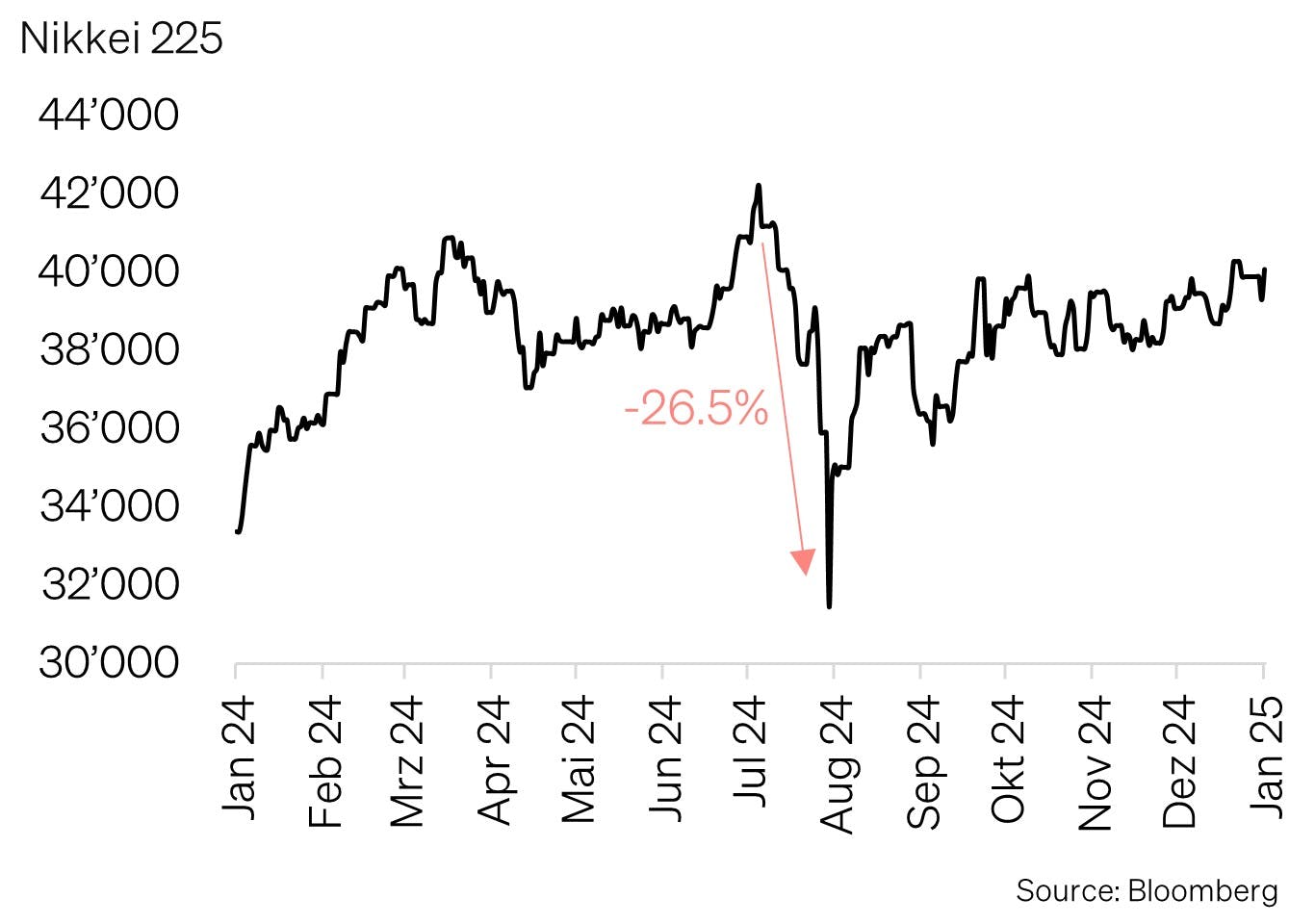 Das Aktienjahr 2024 verlief jedoch nicht ohne Turbulenzen. Insbesondere der japanische Aktienmarkt zog die globale Entwicklung vorübergehend nach unten. Im August verzeichnete der zweitgrösste Aktienmarkt einen Einbruch von über 25%, ausgelöst durch Unsicherheiten am Zinsmarkt. Immerhin konnte sich der japanische Markt bis zum Jahresende erholen und mit einem Plus von über 20% abschliessen. Diese Volatilität zeigte jedoch, wie fragil die aktuellen Kursavancen teilweise sind.