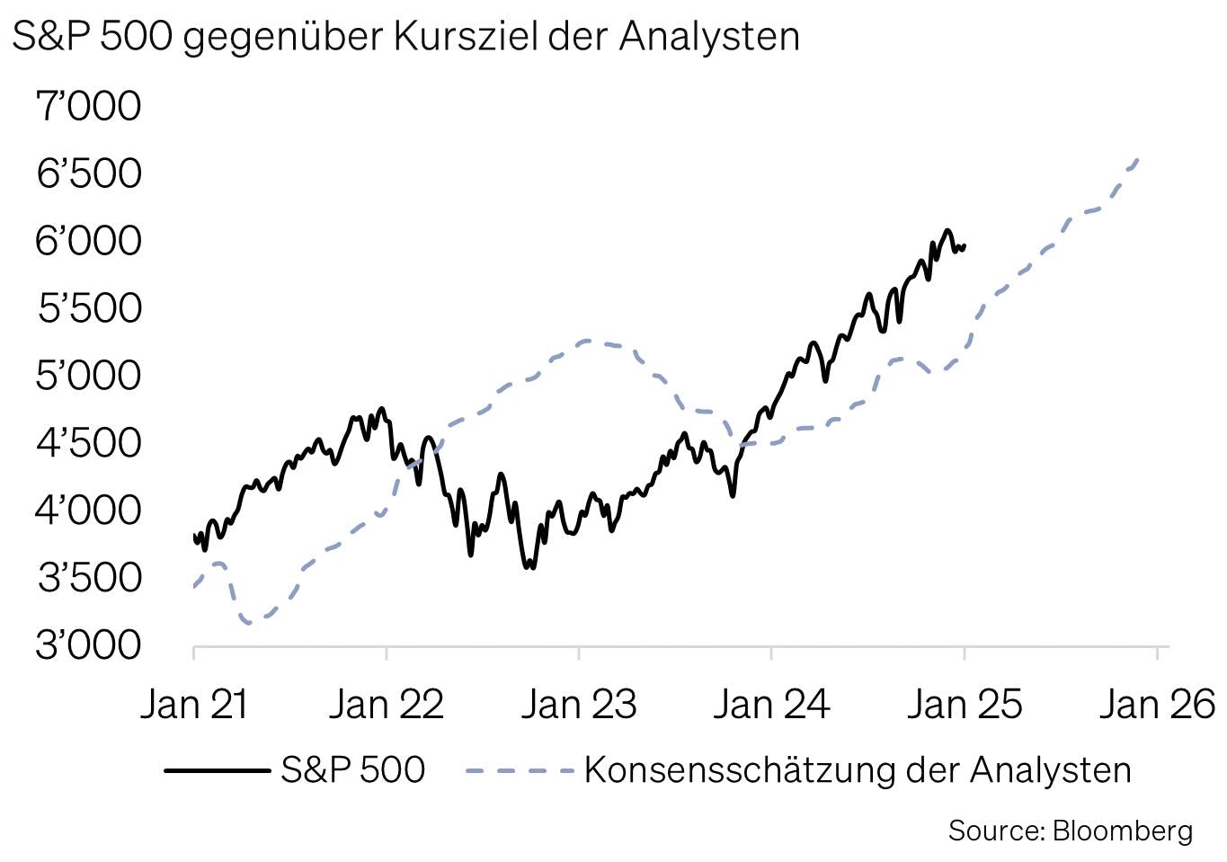 Das Jahr 2024 war erneut ein Jahr der Überraschungen an den globalen Aktienmärkten – allen voran in den USA. Ende 2023 hatten viele Analysten ihre Prognosen nach einem herausragenden Börsenjahr mit Kursgewinnen von über 25% vorsichtig angesetzt. Der Konsens lag bei einem durchschnittlichen Kursziel von 4.584 Punkten für den S&P 500. Doch der Index schloss das Jahr 2024 bei knapp 5.900 Punkten – einem weiteren Anstieg von über 25%, der selbst die kühnsten Erwartungen übertraf.
