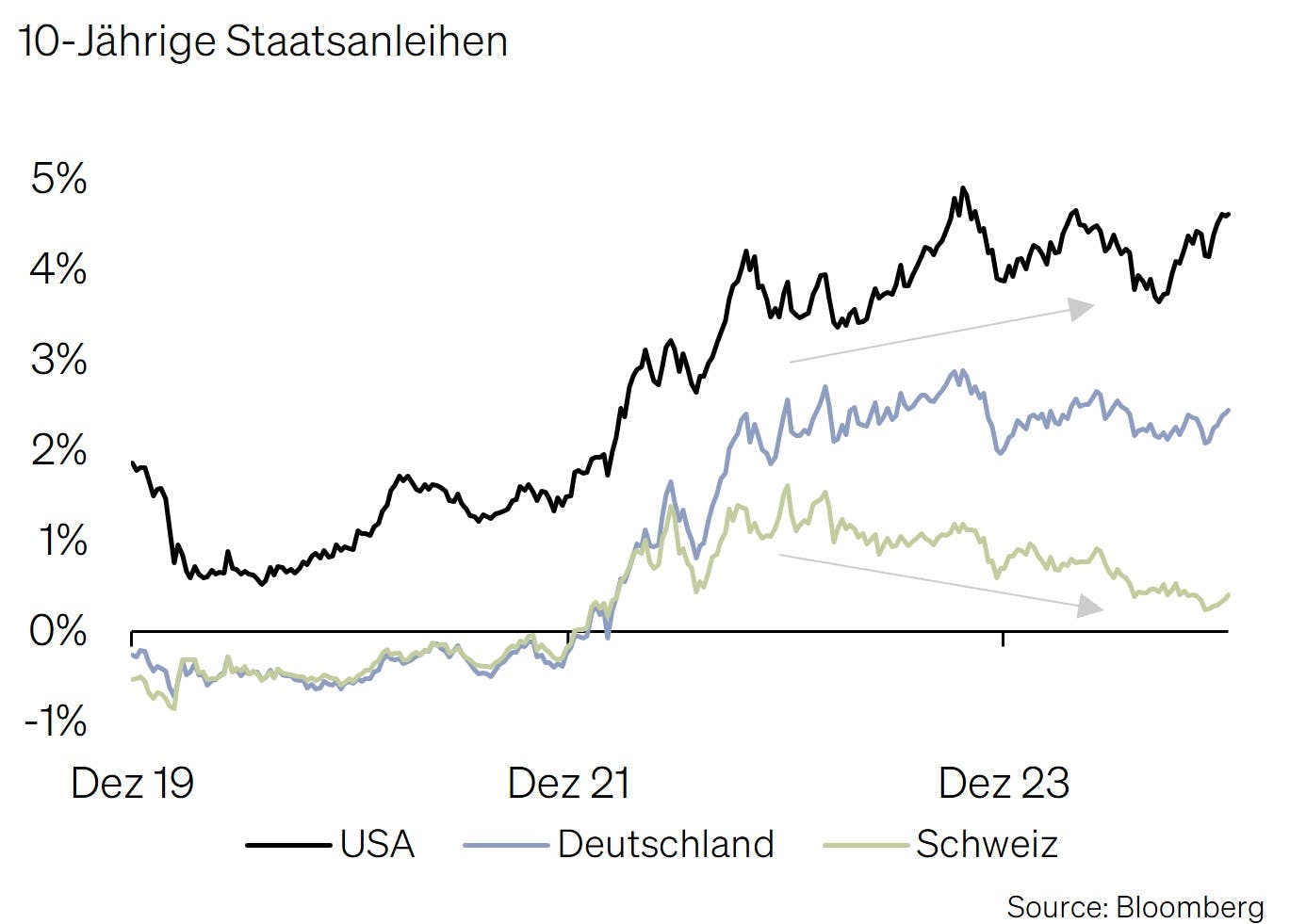 Im Gegensatz dazu blieb die Federal Reserve (Fed) aufgrund der weiterhin erhöhten Inflation zurückhaltender. Während der Markt noch im Dezember 2023 mit sechs Zinssenkungen im Jahr 2024 gerechnet hatte, wurden nur vier umgesetzt. Diese Vorsicht führte dazu, dass die Renditen 10-jähriger US-Staatsanleihen trotz sinkenden Leitzinsen im Jahr 2024 anstiegen. Dennoch erzielten US-Anleihen aufgrund der bereits hohen Verzinsung von über 4% knapp positive Gesamtrenditen.
