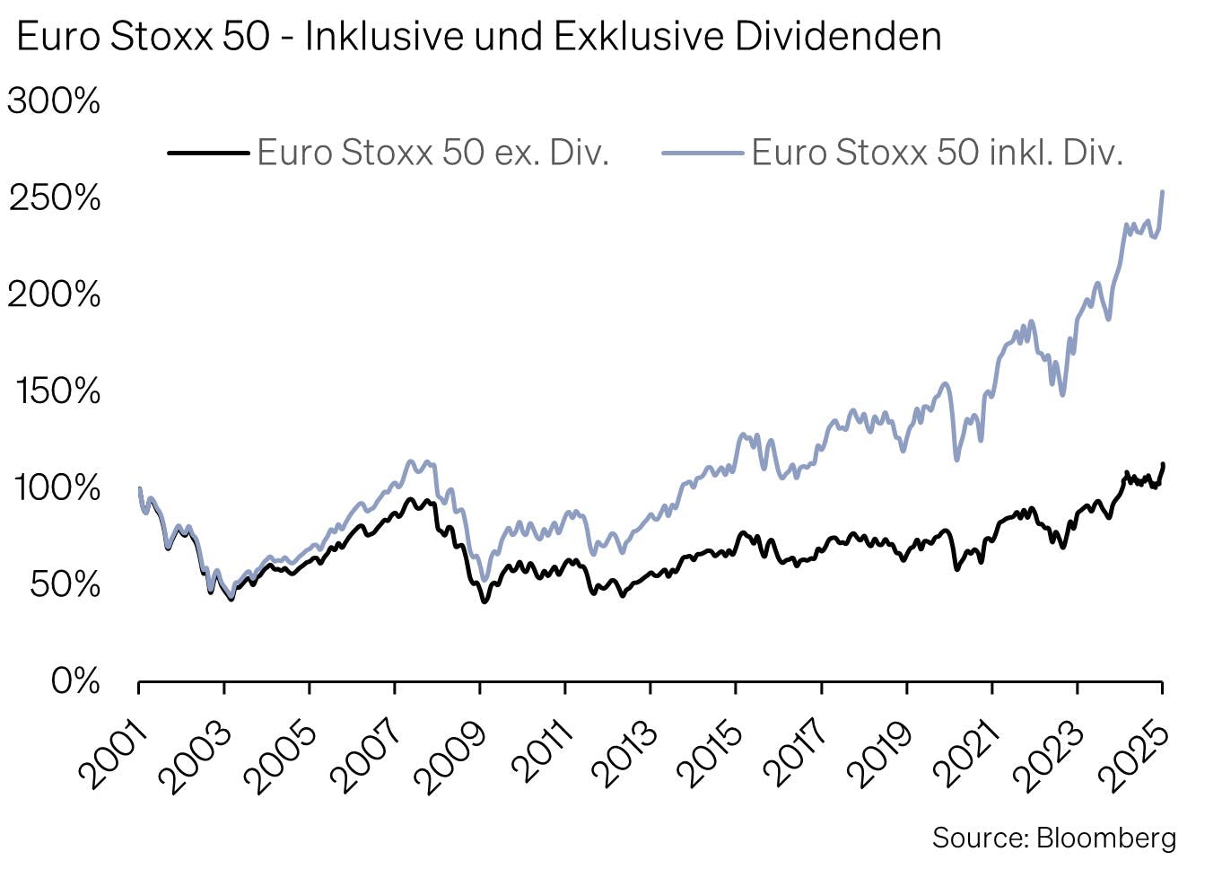 Ein unerwarteter Trend seit Jahresbeginn war die überdurchschnittliche Rendite europäischer Aktien. Während US-Werte hinter den globalen Märkten zurückbleiben, kletterte der Euro Stoxx 50 erstmals seit 25 Jahren auf ein neues Rekordhoch. Diese Entwicklung kommt überraschend, da Analysten für 2025 mehrheitlich eine anhaltende Outperformance der US-Märkte prognostiziert hatten. Die folgende Grafik unterstreicht einmal mehr, welche Bedeutung Dividenden im langfristigen Anlagehorizont haben. Während der Index nominell immer noch auf dem Niveau von 2000 notiert, haben Anleger, die ihre Dividenden reinvestierten, ihren Einsatz mehr als verdoppelt.