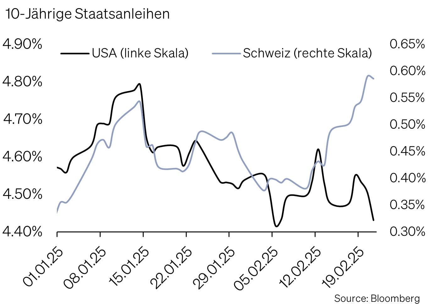 Nach einem volatilen Jahr 2024 verlief der Jahresstart für den Anleihenmarkt, mit Ausnahme der Schweiz, bislang positiv. Die Rendite von US-Staatsanleihen erreichte im Januar mit 4,8% einen Höchststand, bevor sie sich seither zurückbewegte. Auch in der Eurozone war die Entwicklung ähnlich, mit insgesamt leicht rückläufigen Renditen.