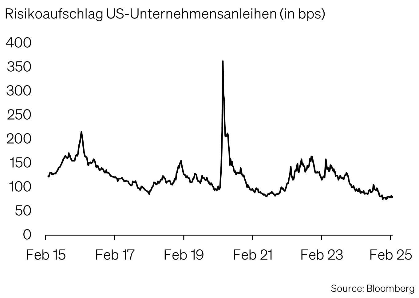 Während Unternehmensanleihen derzeit stabile Risikoaufschläge verzeichnen, könnte sich dies bei anhaltenden makroökonomischen Unsicherheiten schnell ändern. Besonders hochverzinsliche Anleihen bergen ein asymmetrisches Risiko – das Potenzial für tiefere Aufschläge scheint begrenzt, während eine Ausweitung der Risikoaufschläge von diesen tiefen Niveaus oftmals drastisch erfolgte. Die Unsicherheit über den geldpolitischen Kurs der Fed sowie eine schwer berechenbare US-Regierung sind Gründe, um grössere Risiken bei den Anleihen zu meiden.