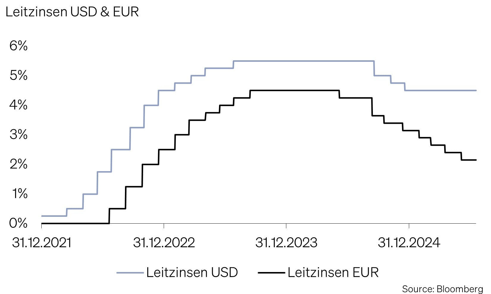 Die US-Notenbank bleibt in der Kommunikation bezüglich Zinssenkungen vorsichtig, obwohl die Inflation in den vergangenen Monaten nachgegeben hatte. Doch dieser rückläufige Trend scheint inzwischen gestoppt: in mehreren Bereichen sind bereits wieder steigende Preise zu beobachten. Gründe dafür sind unter anderem die neuen Importzölle, die unberechenbare Politik aus dem Weissen Haus und mögliche Zweitrundeneffekte auf die Preise. Der Markt rechnet dennoch mit zwei Zinssenkungen bis Jahresende, zusammen rund 0,5 %.