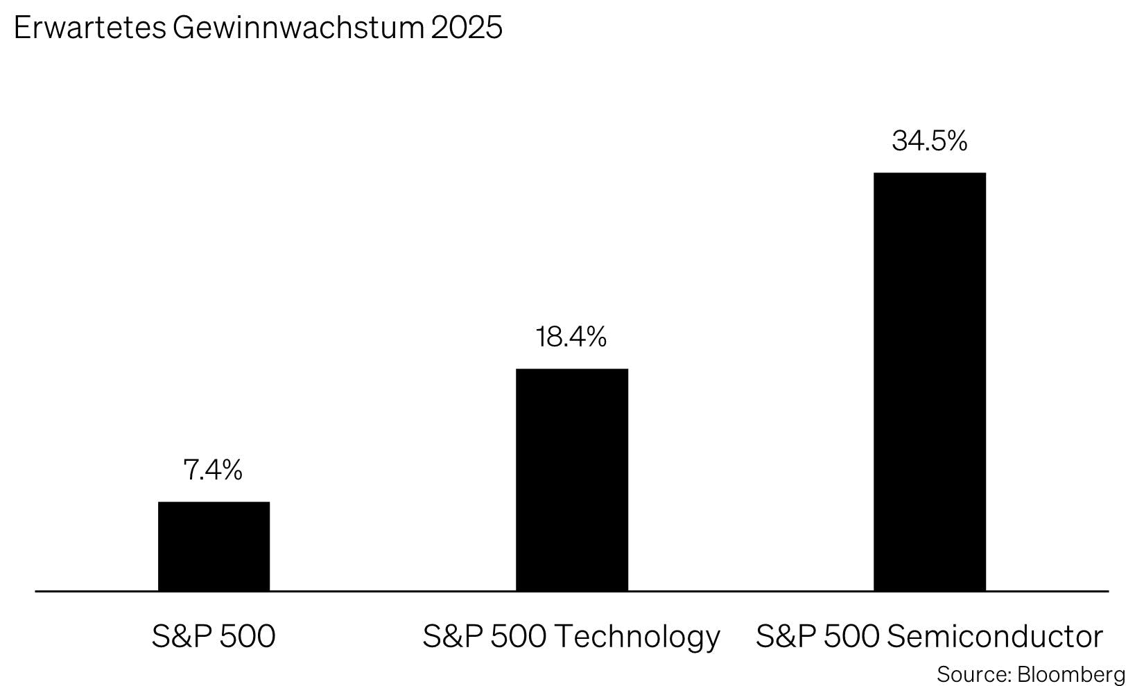 Ein Blick auf die aktuellen Gewinnprognosen für 2025 unterstreicht diese Dynamik eindrucksvoll: während der Gesamtmarkt (S&P 500) ein erwartetes Gewinnwachstum von 7,4 % aufweist, liegt der Technologiesektor bei 18,4 % und der Subsektor Halbleiter sogar bei beeindruckenden 34,5 %.