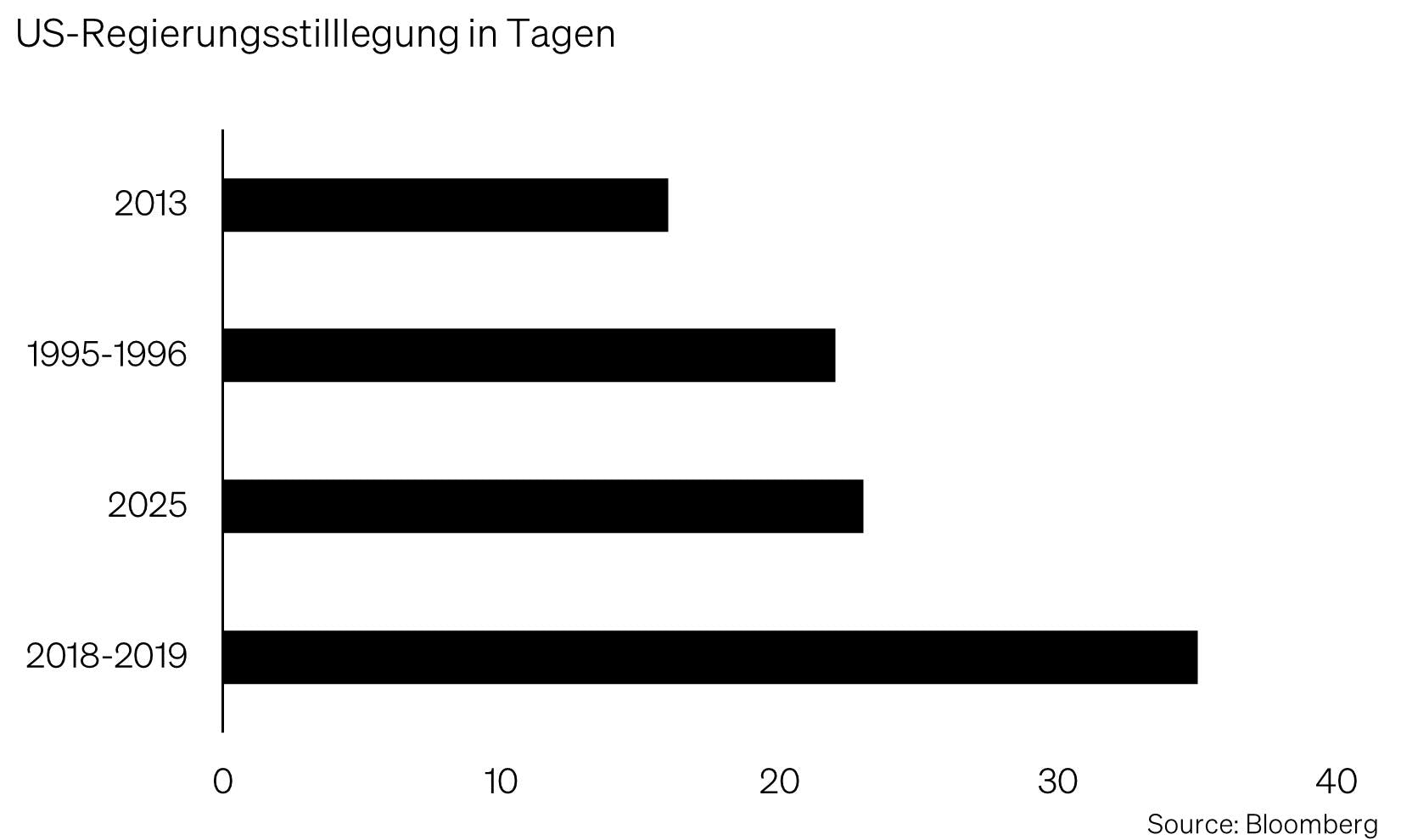 In den USA stagniert die wirtschaftliche Aktivität laut dem Beige Book der Fed, einem regelmässig erscheinenden Bericht über die regionale Wirtschaftslage. Konsum und Beschäftigung stützen die Konjunktur, doch die Dynamik flacht ab. Der Arbeitsmarkt bleibt stabil, Neueinstellungen erfolgen aber zurückhaltender. Der seit 1. Oktober anhaltende Government Shutdown, einer der längsten in der Geschichte, erschwert die Beurteilung der aktuellen Lage, da wichtige Wirtschaftsdaten fehlen.