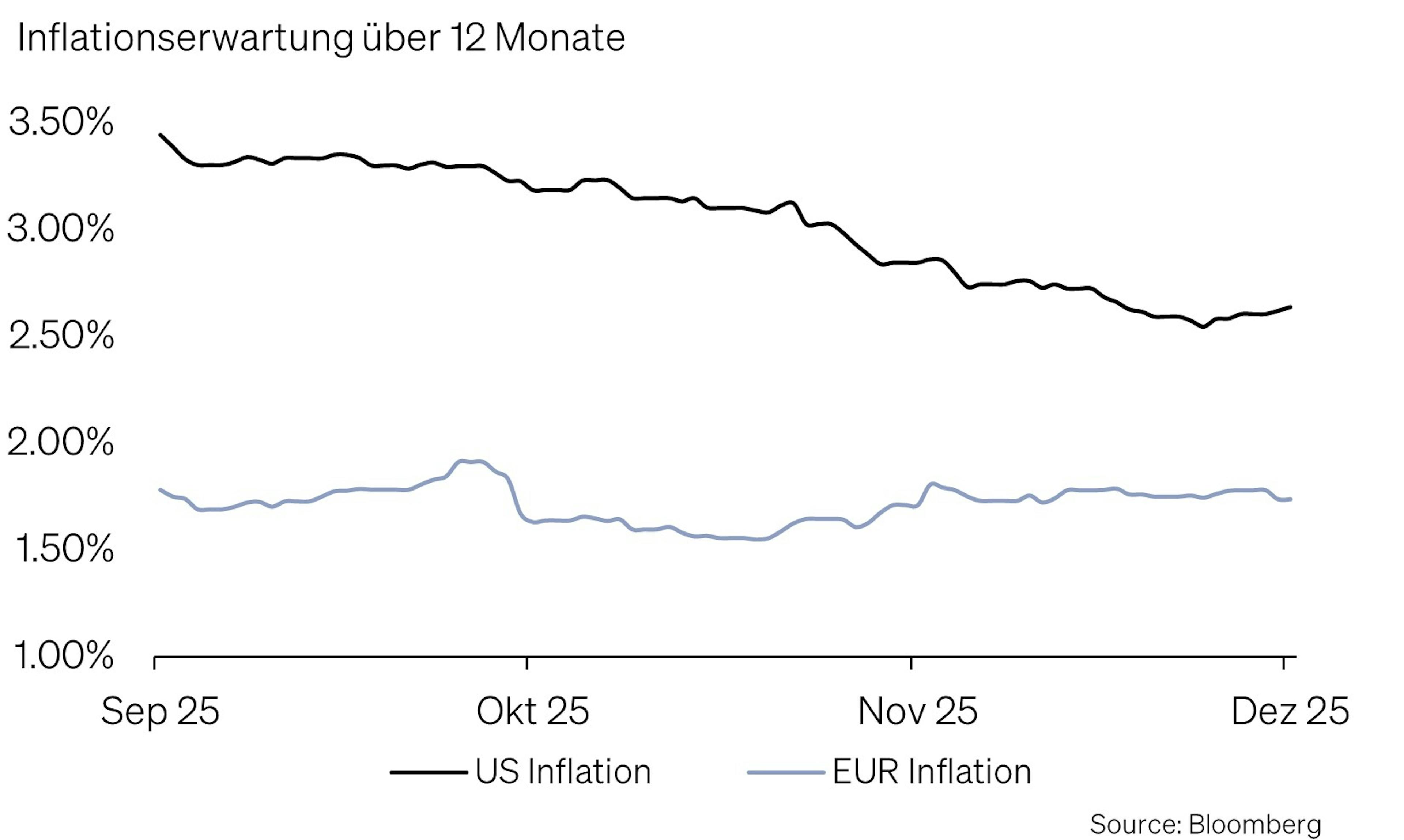 Nachdem die Fed für Dezember keine feste Zinssenkung zugesichert hatte, stiegen die Renditen zunächst an. Inzwischen, nach schwächeren Wirtschaftsdaten, preist der Markt eine 95%-Wahrscheinlichkeit für eine Zinssenkung ein – die USD-Zinsen und die Inflationserwartungen sind entsprechend gefallen.