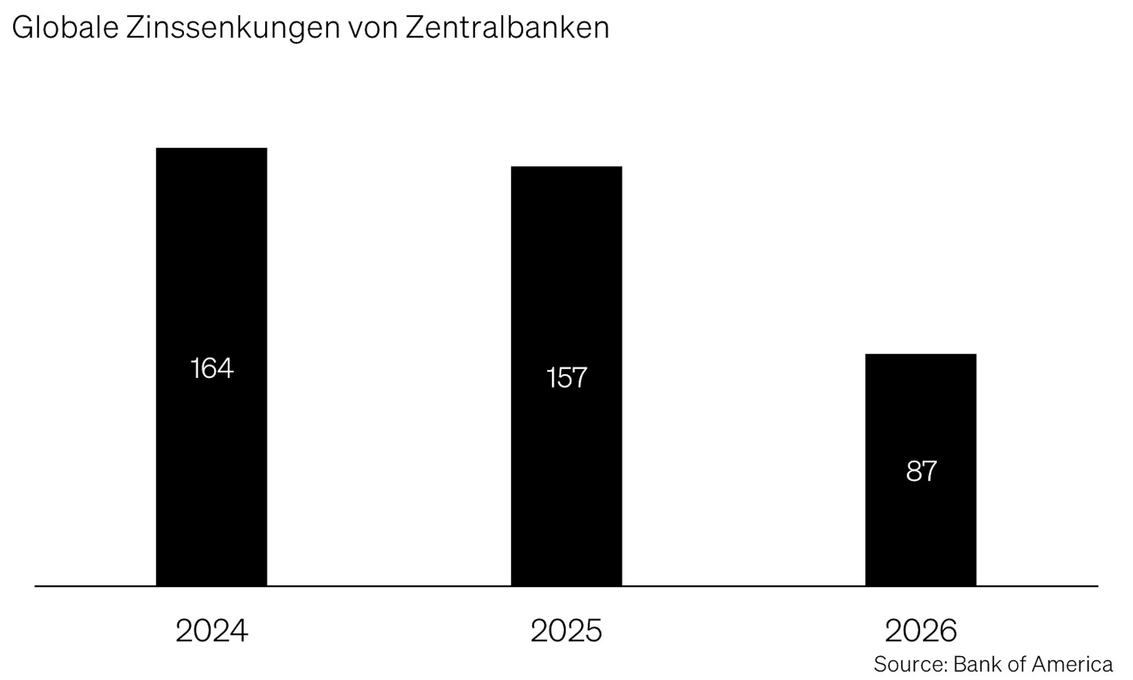 Der globale Rückenwind durch Zinssenkungen lässt nach. 2024 wurden weltweit 164 Zinssenkungen gezählt, 2025 noch 157. Für 2026 werden gemäss der Bank of America nur noch rund 87 erwartet. 2026 wird damit nicht das Jahr einer breiten Lockerungswelle, sondern eines der Feinjustierung – und möglicher Überraschungen. Lockerung bleibt Thema, aber langsamer, selektiver und datengetrieben.