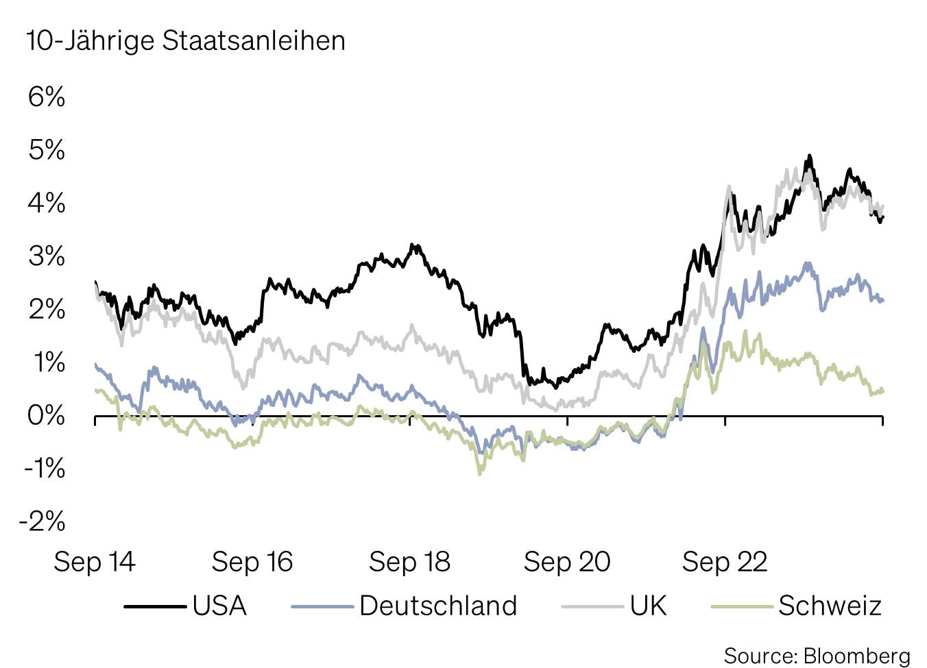 Damit gehen die Märkte aktuell von einem sehr optimistischen Szenario aus: Eine US-Wirtschaft, die sich durch Zinssenkungen stabilisiert, rekordtiefe Risikoaufschläge und günstigere Finanzierungen für Unternehmen, kombiniert mit einem Gewinnwachstum im zweistelligen Prozentbereich. Der Arbeitsmarktbericht vom August sowie eine Vielzahl der Frühindikatoren zeigen jedoch deutlich, dass Enttäuschungen möglich sind. Wir bleiben somit vorerst bei unserer neutralen Allokation von Anleihen und Aktien. Die Sensibilität gegenüber Wirtschaftsdaten wird im Vorfeld der US-Wahlen hoch bleiben, womit eine Präferenz für Qualität und Stabilität im Portfolio zu bevorzugen ist.Die grosse Zinswende