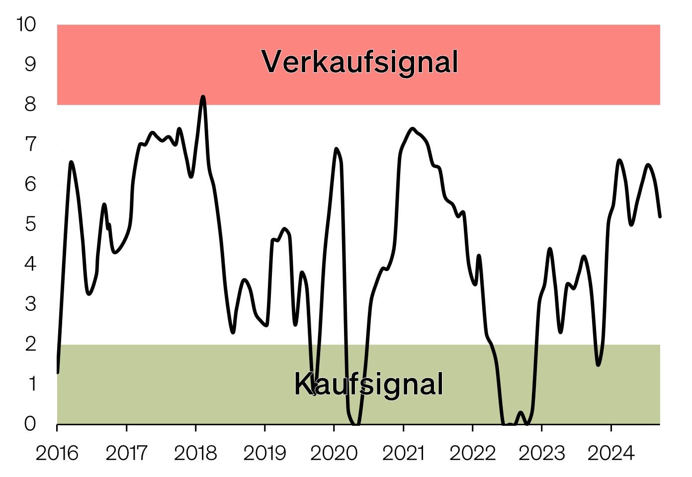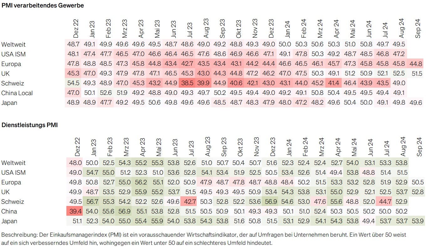 Damit gehen die Märkte aktuell von einem sehr optimistischen Szenario aus: Eine US-Wirtschaft, die sich durch Zinssenkungen stabilisiert, rekordtiefe Risikoaufschläge und günstigere Finanzierungen für Unternehmen, kombiniert mit einem Gewinnwachstum im zweistelligen Prozentbereich. Der Arbeitsmarktbericht vom August sowie eine Vielzahl der Frühindikatoren zeigen jedoch deutlich, dass Enttäuschungen möglich sind. Wir bleiben somit vorerst bei unserer neutralen Allokation von Anleihen und Aktien. Die Sensibilität gegenüber Wirtschaftsdaten wird im Vorfeld der US-Wahlen hoch bleiben, womit eine Präferenz für Qualität und Stabilität im Portfolio zu bevorzugen ist.