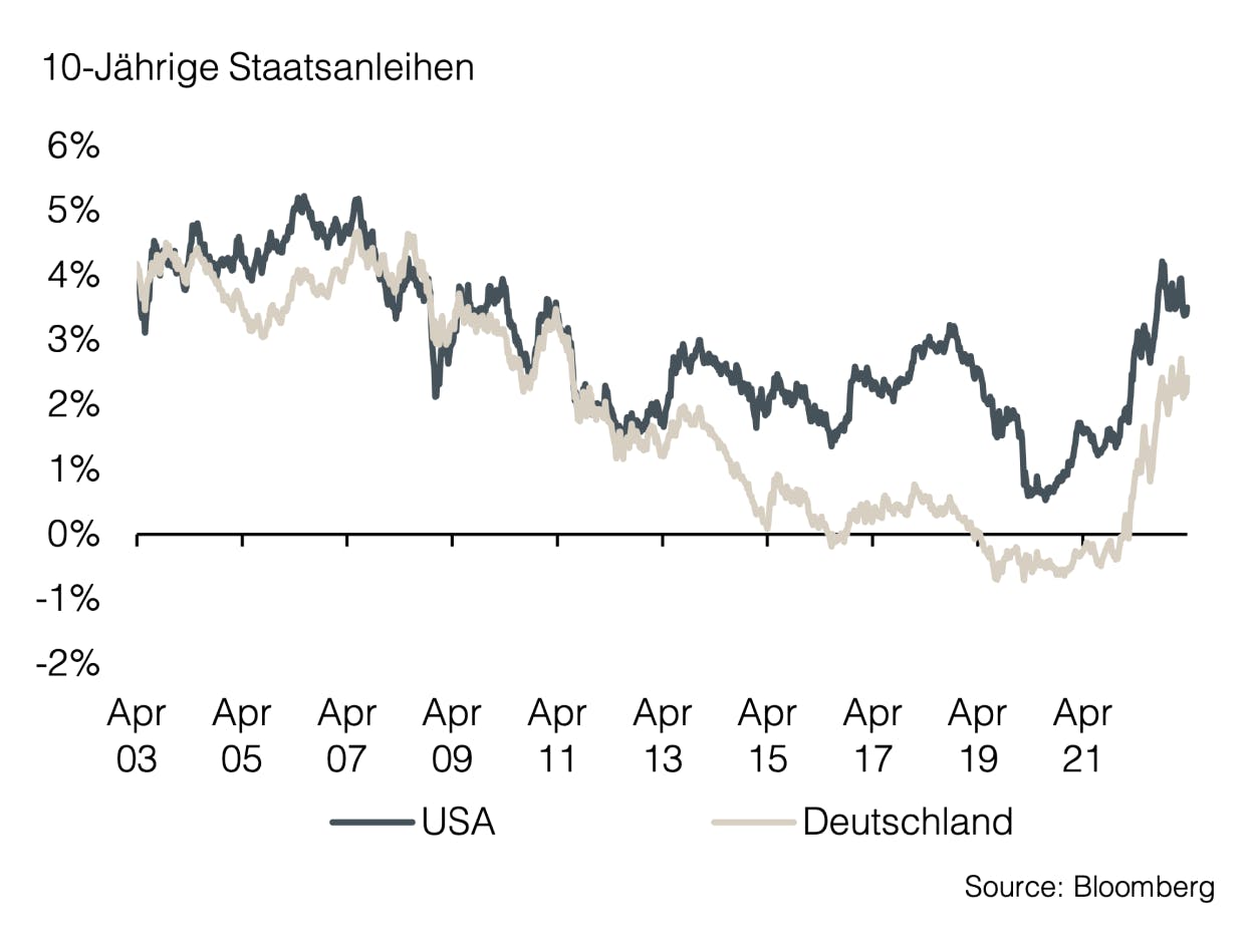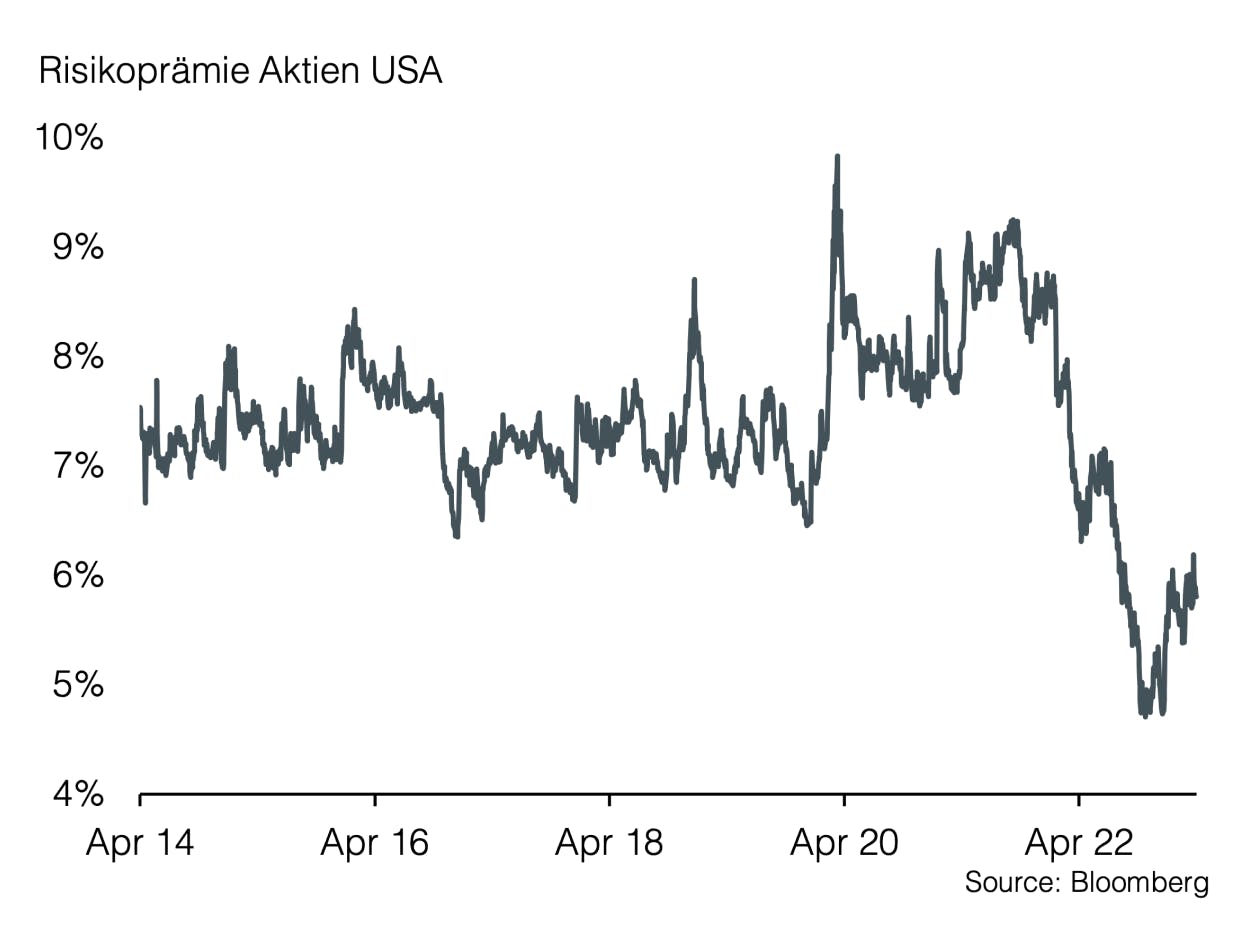 Die steigende Visibilität in Bezug auf eine erfolgreiche Inflationsbekämpfung bekräftigt uns in der Präferenz langlaufender Staatsanleihen und erstklassiger Unternehmensanleihen. Hier nutzen wir das attraktive Zinsniveau für eine weitere Verlängerung der Laufzeiten, da im Hinblick auf eine wirtschaftliche Abschwächung Anleihen von hoher Qualität wieder ihre diversifizierende Wirkung entfalten dürften. Die regionalen Unterschiede für USD, GBP, EUR und CHF bleiben jedoch bestehen. Die Risikoaufschläge dürften aus unserer Sicht noch steigen, weshalb wir in Bezug auf Kreditrisiken weiterhin eine defensive Positionierung empfehlen. Aktien bleiben untergewichtet. Die starken Kursgewinne in den USA nehmen wir zum Anlass, die Region und damit auch die damit verbundene starke Gewichtung von Technologiewerten zu reduzieren. Grund dafür ist unter anderem auch der Abbau von Konzentrationsrisiken, da im ersten Quartal rund 87% der Kursgewinne von nur zehn Unternehmen kamen.