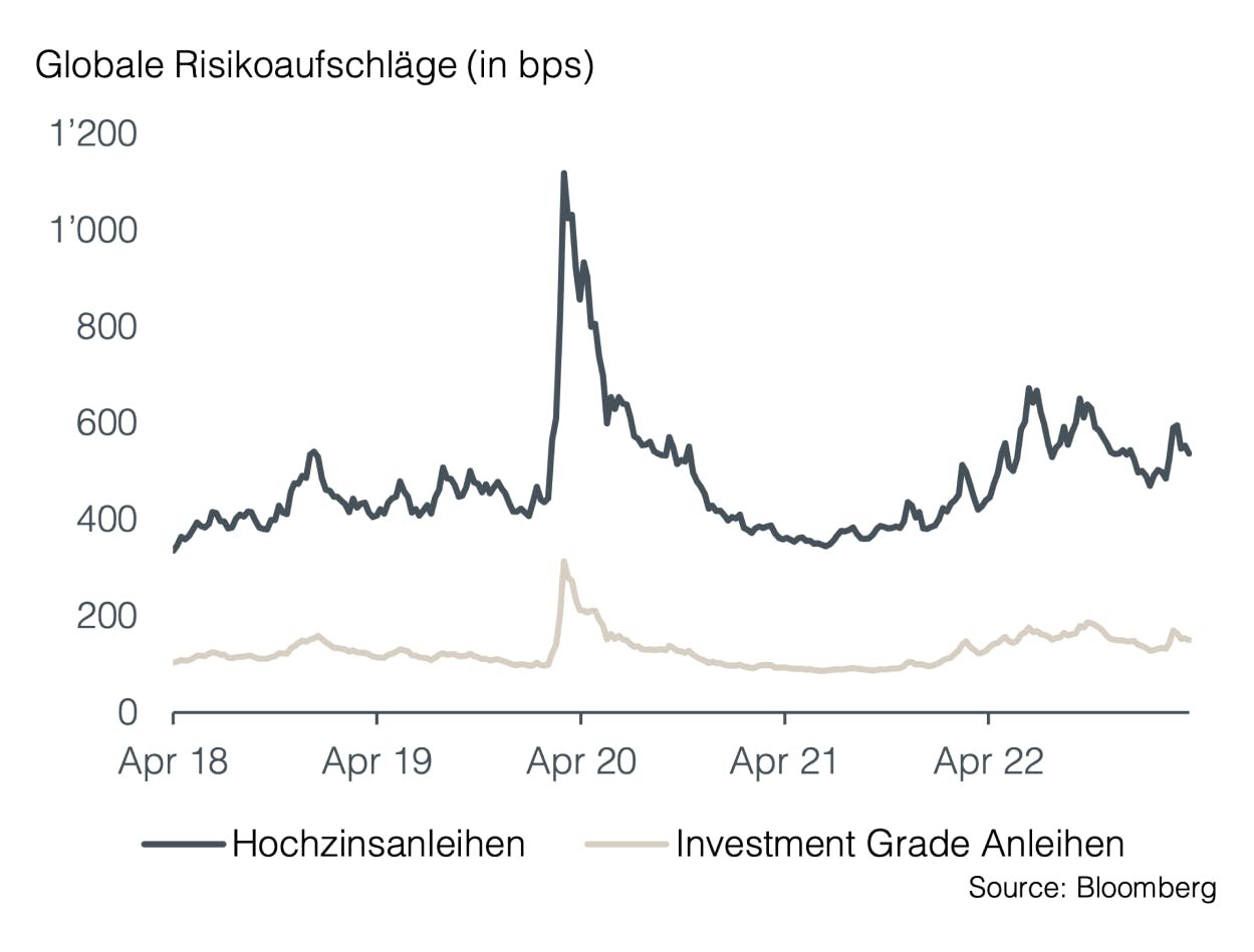 Erwartungsgemäß haben die US-Banken die Bedingungen für die Kreditvergabe bereits verschärft. Auch in Europa ist die Kreditvergabe der Banken drei Monate in Folge gesunken, was sonst nur in wirtschaftlichen Krisenzeiten der Fall ist. Während die Kreditverfügbarkeit aktuell sinkt, werden die Effekte davon jedoch verzögert wahrgenommen. Die Frühindikatoren im verarbeitenden Gewerbe deuten bereits darauf hin, dass sich der Arbeitsmarkt in den nächsten Monaten entspannen dürfte. Ein signifikanter Anstieg der Anträge auf Arbeitslosenunterstützung wäre für die Notenbanken das fehlende Puzzle-Teil in Bezug auf die erfolgreiche Bekämpfung der Teuerung. Dies dürfte jedoch mit tieferen Unternehmensgewinnen und folglich einer Rezession einhergehen. Gemäß den Schätzungen von Bloomberg Economics ist die Wahrscheinlichkeit einer US-Rezession im laufenden Jahr bei 100%.