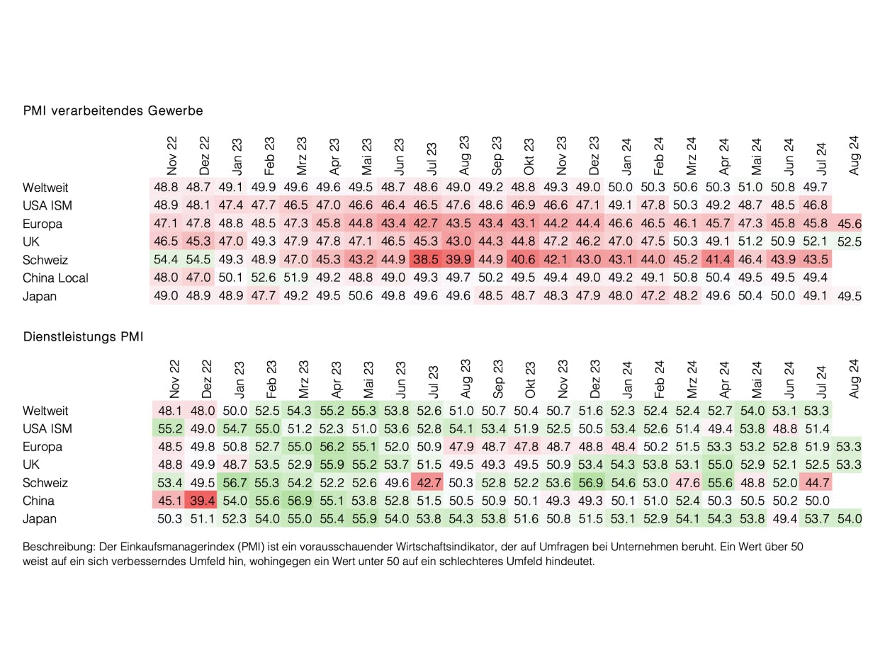 Dies signalisiert zugleich einen Regimewechsel: Schlechte Nachrichten sind jetzt wohl auch als solche zu interpretieren. Allerdings spiegeln die aktuellen Daten keineswegs eine Wirtschaft wider, die die Volatilität zu Beginn des Monats rechtfertigen würde. Während klare Anzeichen einer abnehmenden Dynamik vorhanden sind, ist dies genau das, was die Zentralbanken beabsichtigt haben. Es gibt genügend Anzeichen dafür, dass eine sanfte Landung der Wirtschaft ein realistisches Szenario ist. Nun scheinen die Weichen für graduelle Zinssenkungen auch in den USA gestellt zu sein, was das Investitionsumfeld verbessert. Dennoch dürfte die Sensitivität gegenüber negativen makroökonomischen Überraschungen zunehmen, was in den kommenden Wochen zu erhöhter Volatilität führen könnte.