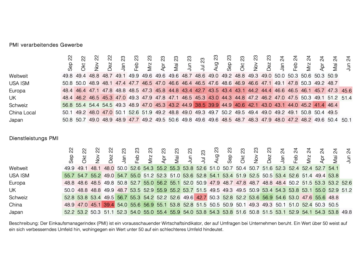 Die Einkaufsmanagerindizes (PMI) zeigten im Juni eine positive Entwicklung. Sowohl das verarbeitende Gewerbe als auch der Dienstleistungssektor konnten zulegen. Besonders bemerkenswert ist, dass der globale Index für das verarbeitende Gewerbe auf den höchsten Stand seit Juli 2022 gestiegen ist. Gleichzeitig erreichte der Dienstleistungssektor den höchsten Wert der letzten zwölf Monate. Die Kombination von tieferer Inflation und einem positiven Ausblick für Industrie und Dienstleister entspricht definitiv dem Geschmack der Anleger.