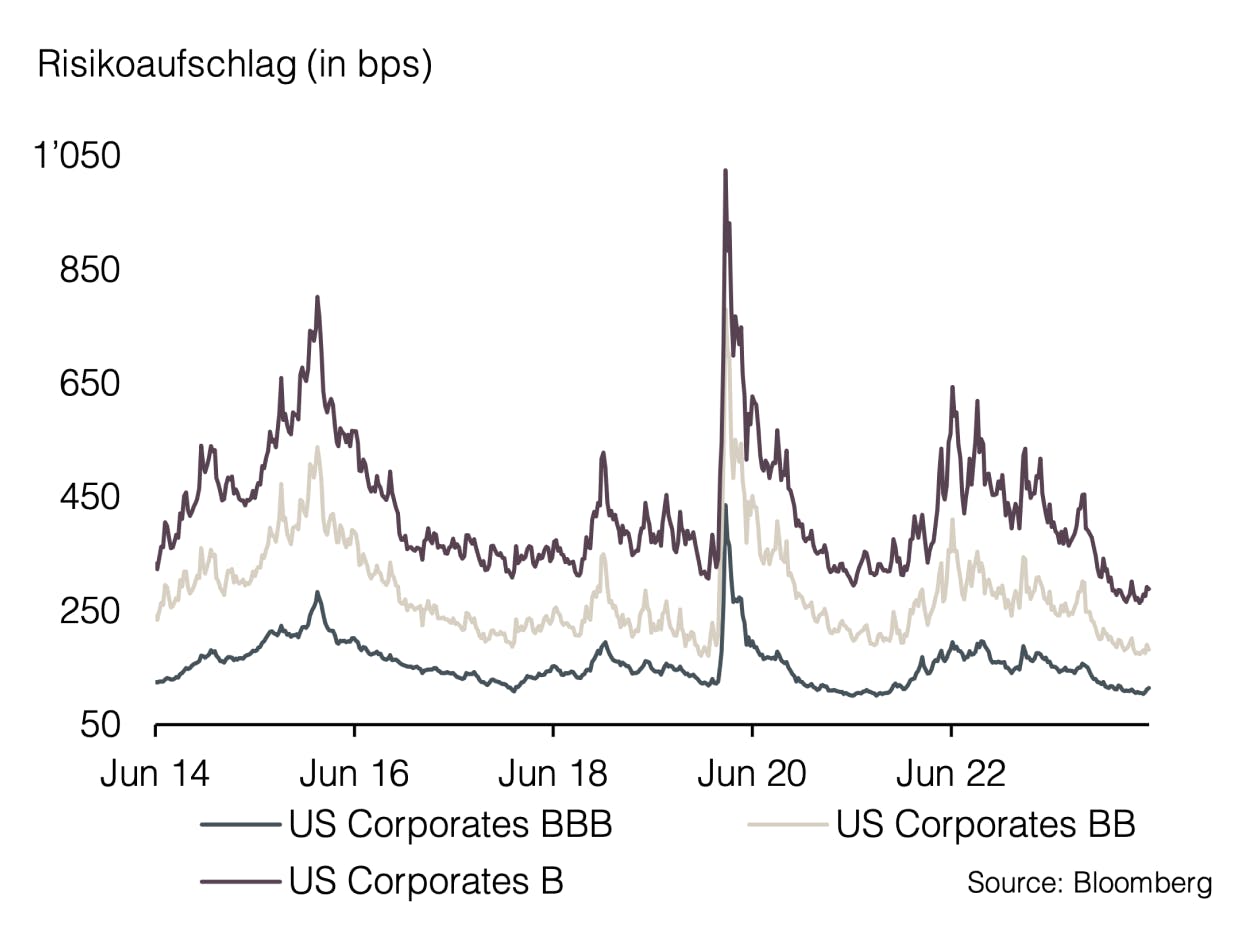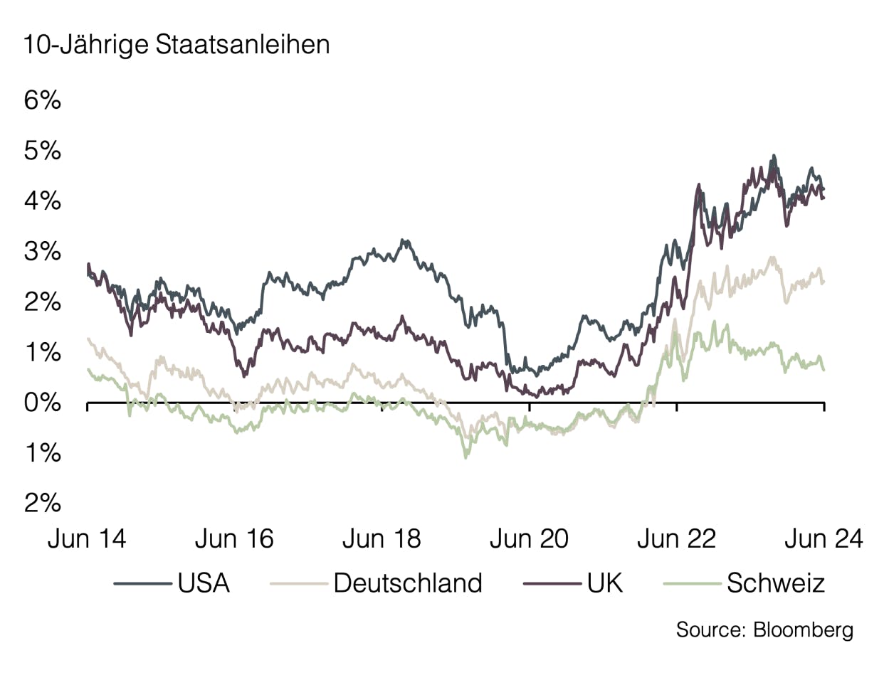 Dass die US-Leitzinsen noch immer bei 5.5% verharren, war jedoch zu Jahresbeginn alles andere als ein Wunschszenario. Damals wurden sechs Zinssenkungen für 2024 prognostiziert – die erste bereits im März. Rückblickend lässt sich somit feststellen, dass die Finanzmärkte trotz höherer Zinsen die Renditeerwartungen in der ersten Halbzeit 2024 übertroffen haben. Die kommenden Monate werden zeigen, ob sich dieser Trend fortsetzt und sich die erhoffte Stabilität der Märkte fortsetzt. Aktuell rechnet der Markt mit einem schon fast perfekten Szenario von steigendem Gewinnwachstum bei den Unternehmen, sinkenden Zinsen und gleichzeitig sinkender Inflation. Mit diesen Perspektiven blicken wir gespannt auf die zweite Halbzeit 2024, in der sich zeigen wird, ob die positiven Erwartungen enttäuscht werden. Über die nächsten Wochen erwarten wir vor allem aus dem Konsumbereich aufschlussreiche Daten, welche mehr Visibilität in Bezug auf das Wachstum geben werden. Eine Zinssenkung im Anschluss an die US-Wahlen scheint uns durchaus realistisch.