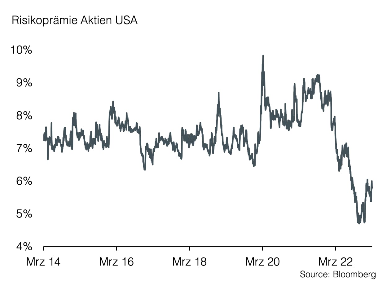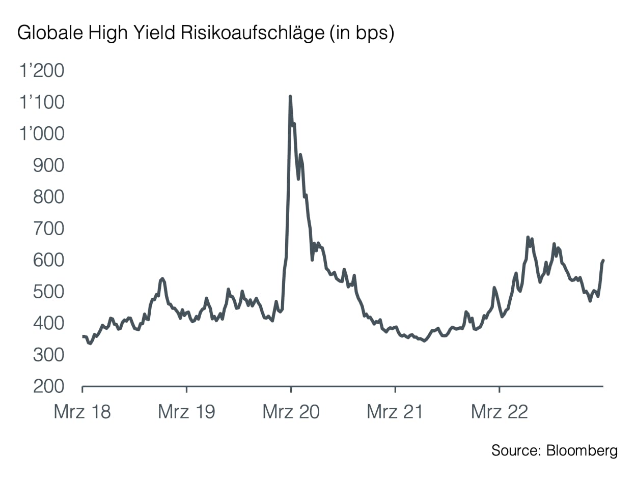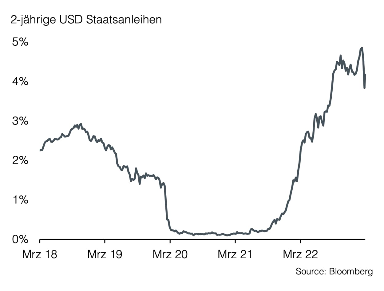 Die Entwicklungen zeigen auf, dass die Zentralbanken mit ihrer restriktiven Geldpolitik das Ziel erreicht, sogar vermutlich bereits überschritten haben. Grundsätzlich folgen auf Bankenkrisen jeweils strengere Standards in der Kreditvergabe und eine geringere Risikobereitschaft der Unternehmen und Anleger. In den USA dürften KMUs am stärksten betroffen sein, da sie am meisten von der Kreditvergabe regionaler Banken abhängig sind. US-Kleinunternehmen schaffen fast zwei Drittel der Arbeitsplätze in Amerika, so dass die geringere Verfügbarkeit von Krediten zu einem Anstieg der Arbeitslosigkeit führen dürfte. Diese Effekte werden zwar mit Verzögerung in der Wirtschaft ankommen, der Inflationsdruck dürfte in der Folge aber abnehmen. Das zeigt sich deutlich in der Marktentwicklung: Der erwartete Leitzins der Fed per Jahresende ist letzte Woche von 5,5% auf 4% gefallen. Nicht überraschend sank die US-Inflationserwartung über die nächsten 12 Monate auf 2,4%.