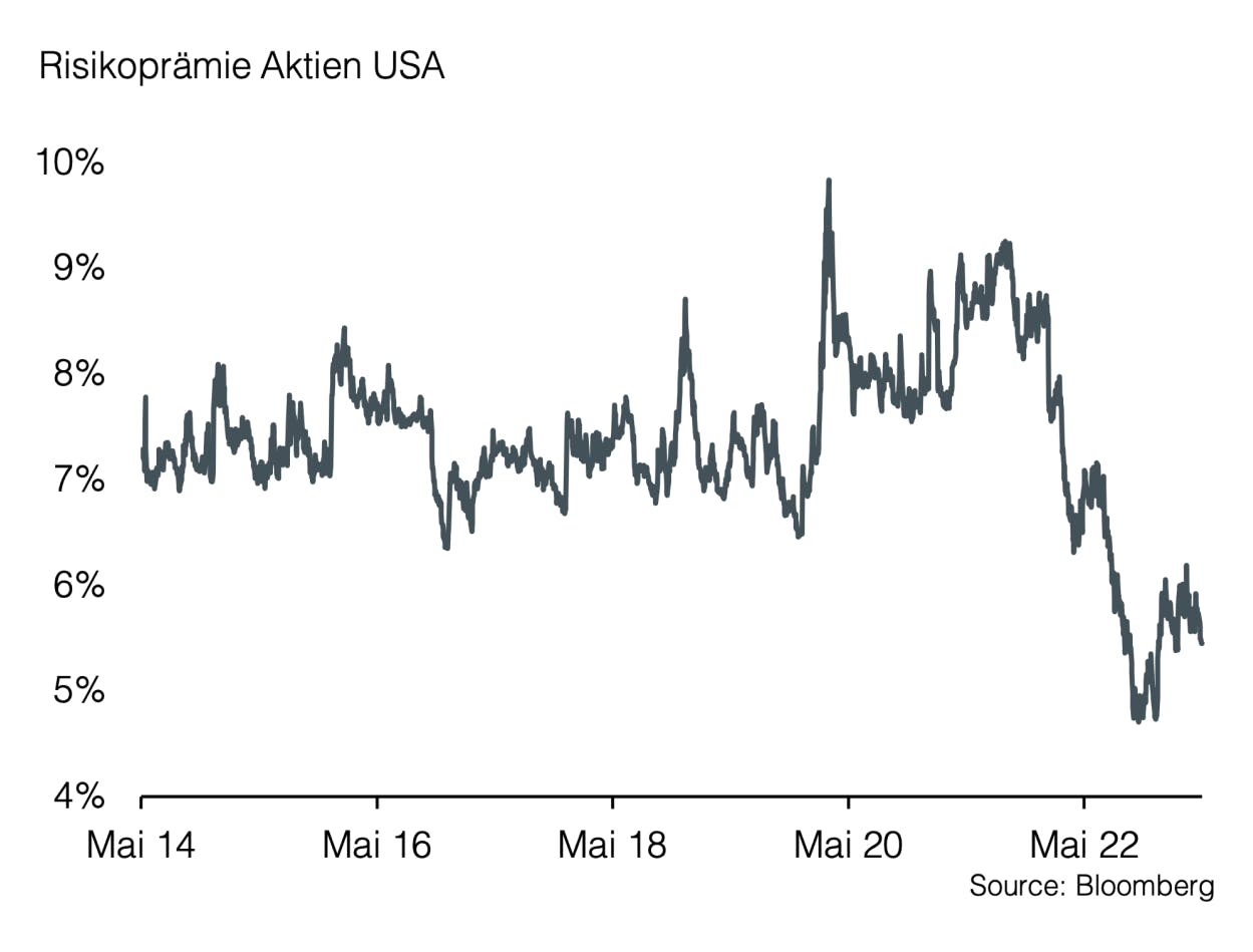Am Aktienmarkt sind derzeit nur wenige Anzeichen dieser negativen wirtschaftlichen Entwicklung erkennbar. Deshalb lohnt es sich, die Bewertungen genauer zu betrachten. Die Risikoprämien im Aktienbereich sind nach wie vor auf einem unattraktiv tiefen Niveau. Steigende Kurse werden von sinkenden Gewinnen begleitet, wodurch sich der Markt weiter verteuert hat. Vor allem die US-Schwergewichte wie Apple, Amazon, Google, Microsoft, NVIDIA usw. haben den US-Markt seit Jahresbeginn um über 10 % steigen lassen. Exkludiert man diese Werte, ergibt sich lediglich ein Kursgewinn von 1,7 %. Auch global betrachtet stammen etwas mehr als die Hälfte der Kursgewinne von nur 7 US-Unternehmen, deren Bewertung nun absolut und relativ betrachtet teuer erscheint.