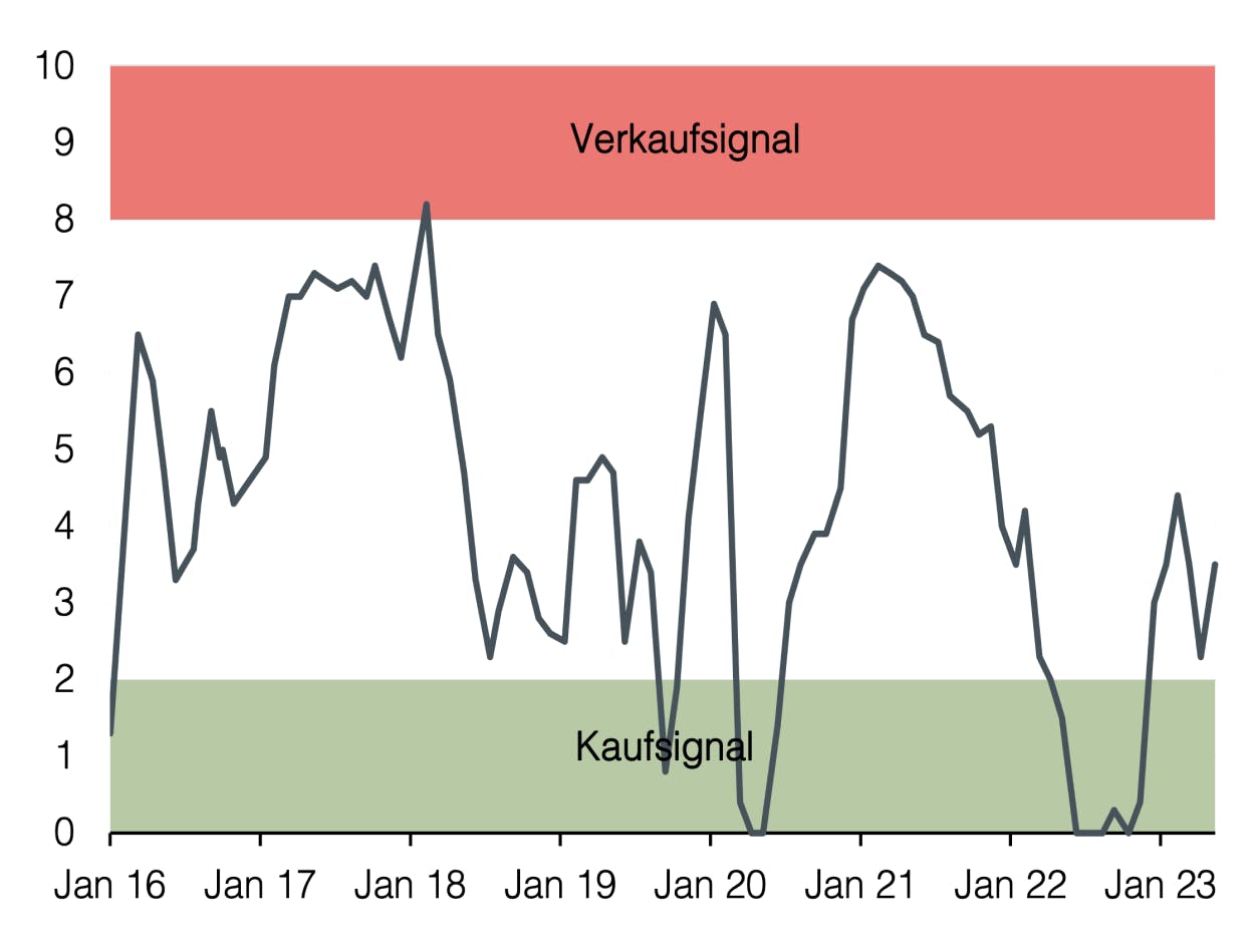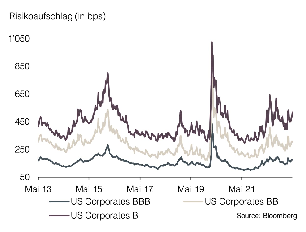 Wir halten darum weiterhin an einer defensiven Positionierung mit einem Untergewicht im Aktienmarkt fest. Wir begrüßen die gesunkene Volatilität am Aktienmarkt, welche eine Absicherung mittels Optionen attraktiv erscheinen lässt. Die steigenden Risikoaufschläge bei Anleihen bestärken uns in der Ansicht, dass bei festverzinslichen Anlagen derzeit Qualität im Fokus der Anleger stehen sollte.