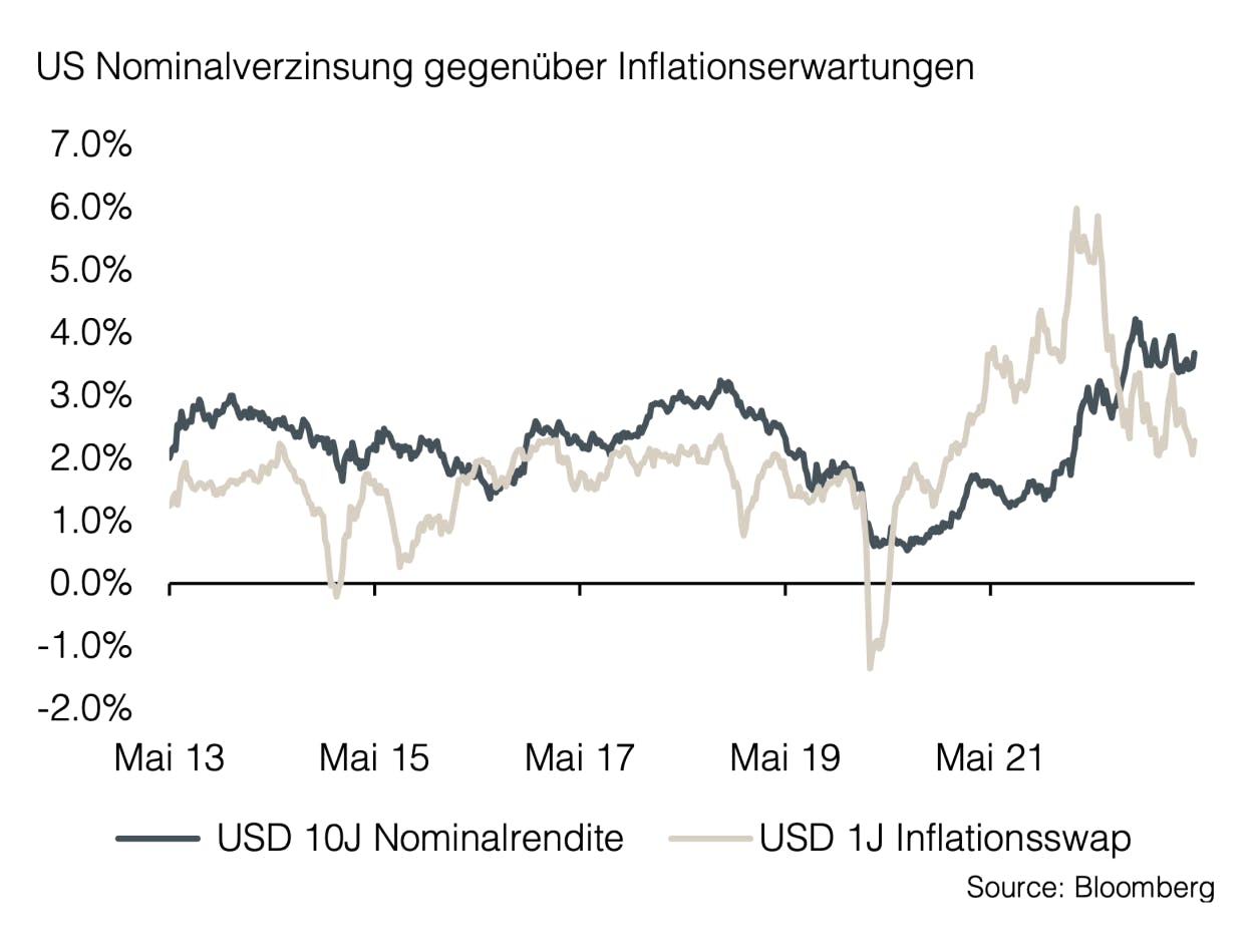 Mit der rückläufigen Inflation zeichnet sich auch ein Ende der restriktiven Geldpolitik ab, die die Märkte seit etwas mehr als einem Jahr maßgeblich geprägt hat. Der Zinsmarkt deutet bereits seit einiger Zeit darauf hin, dass bis zum Jahresende bereits wieder Zinssenkungen der Fed erwartet werden. Die globalen Aktienmärkte profitieren von der Aussicht auf niedrigere Zinsen und widerspiegeln ein nahezu perfektes Szenario: Die Inflation nimmt ab, die Zinsen werden bis 2025 graduell sinken und die Unternehmensgewinne werden in diesem Zeitraum weiterhin steigen. Allerdings rechtfertigt die aktuelle Berichterstattung über die Unternehmensgewinne eine etwas vorsichtigere Haltung. Die Gewinne sind in den meisten Sektoren im Vergleich zum Vorjahr rückläufig, auch wenn sie teilweise die niedrigen Erwartungen der Analysten übertroffen haben. In den kommenden Monaten könnten sich auch die Gewinnmargen negativ entwickeln, da diese stark mit sinkender Inflation korrelieren. Die Normalisierung der Preise dürfte den Fokus der Anleger wieder verstärkt auf die fundamentalen Bewertungsfaktoren lenken. Diese werden jedoch tendenziell negativ durch die veränderte Zinslandschaft geprägt.