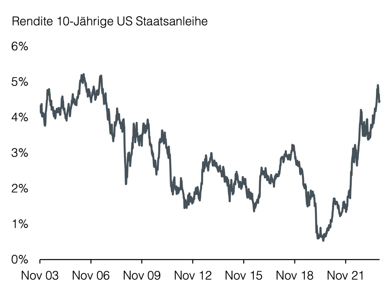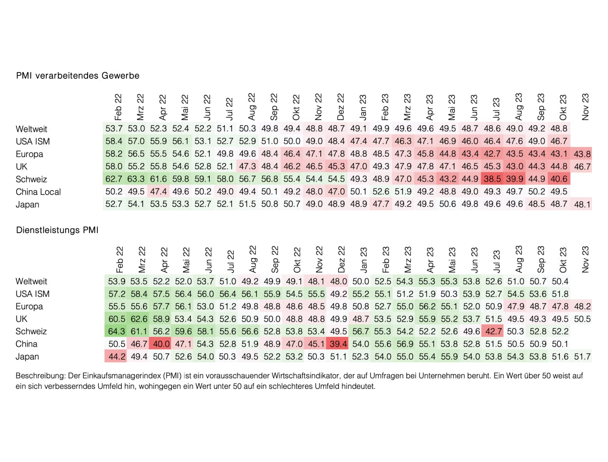 Ein führender wirtschaftlicher Frühindikator in den USA, der ISM Manufacturing Einkaufsmanagerindex, sank auf 46.7 Punkte und verfehlte die Erwartungen der Ökonomen von 49 Punkten deutlich. Neben dem ISM-Frühindikator blieben auch die Entwicklung der Lohnstückkosten, der neu geschaffenen Stellen und der langfristigen Güteraufträge in den USA unter den Erwartungen. Damit sind die positiven Überraschungen in Bezug auf die Wirtschaftslage in den USA, einem Hauptgrund für die hohen Zinsen, seit Mitte des Jahres kontinuierlich rückläufig. Diese Entwicklung wurde durch die neueste Veröffentlichung der Inflationszahlen bestätigt, die sowohl in Europa als auch in den USA ihren sinkenden Trend schneller als von Ökonomen erwartet fortsetzen.