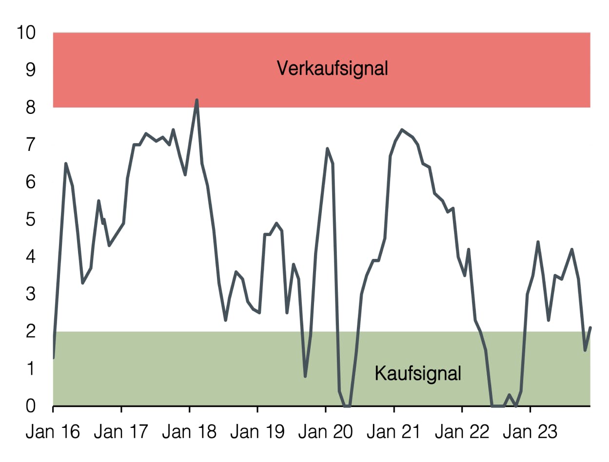 Im Bereich der Anleihen bestätigt die aktuelle Marktentwicklung unsere Positionierung, und wir empfehlen weiterhin Anleihen mit langer Laufzeit und von qualitativ hochwertigen Schuldnern. Aufgrund unattraktiver Risikoaufschläge meiden wir Hochzinsanleihen. Anleihen von Emittenten in Schwellenländern mit hoher Bonität haben aufgrund der tieferen Risikoaufschläge an Attraktivität verloren und werden neu neutral eingestuft. Im Aktienbereich konnten wir im letzten Monat von der Erhöhung der Aktienquote profitieren. Das Kaufsignal des Risiko-Index wurde inzwischen aber durch ein verbessertes Sentiment neutralisiert. Aufgrund leichter Verbesserungen der Risikoprämien und der Frühindikatoren bleibt die Aktienquote jedoch auf neutralem Niveau. Innerhalb der neutralen Aktienquote ist aus unserer Sicht eine vorsichtige Haltung angebracht, wobei wir uns auf Unternehmen mit solidem Dividendenwachstum, attraktiver Bewertung und geringer Verschuldung konzentrieren. Wir bevorzugen aktuell den Sektor Basiskonsumgüter und stufen den Sektor Gesundheitswesen auf neutral zurück.