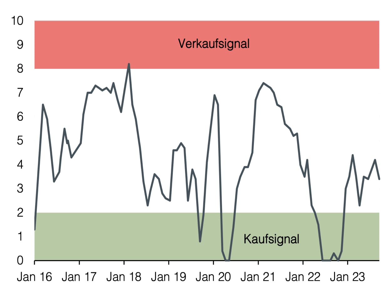 Wir sehen das Zinsniveau weiterhin als attraktiv an, insbesondere da einige Zentralbanken, einschließlich der Schweizerischen Nationalbank, den Zinszyklus größtenteils abgeschlossen sehen. In Bezug auf die Ausfallwahrscheinlichkeiten bleiben wir vorsichtig. Im Aktienbereich mahnen abnehmende Frühindikatoren und die niedrigen Risikoprämien weiterhin zu einer Untergewichtung. Aufgrund hoher relativer Bewertungsunterschiede beurteilen wir den Energiesektor als attraktiv an, sowohl aufgrund fundamentaler Daten als auch struktureller Einflussfaktoren. Im Bereich alternativer Anlagen zeigt sich Gold trotz höherer Zinsen und eines stärkeren US-Dollars bemerkenswert stabil. Eine Gold-Allokation bietet in der aktuellen Marktsituation eine gute Möglichkeit zur Diversifikation.