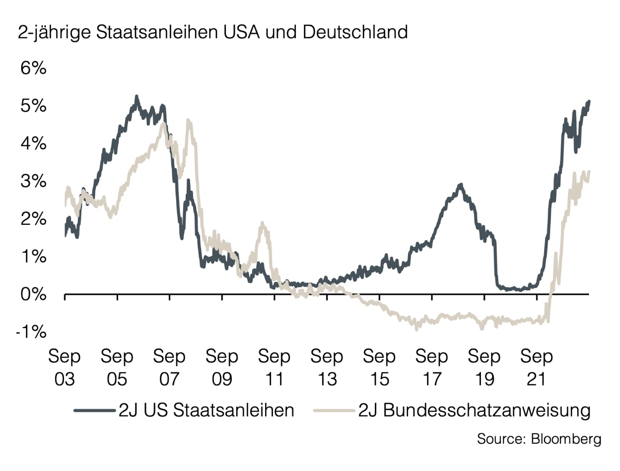 Die neuste Anpassung der Prognosen hat die Marktteilnehmer negativ überrascht. Der Zeitpunkt für die erwartete Zinswende wurde erneut in die Zukunft verschoben. Besonders auffällig war die Änderung in Bezug auf das erwartete Zinsniveau. Noch vor sechs Monaten hatte der Markt erwartet, dass die Zinsen Ende 2024 bei 3% liegen würden. Nach dem letzten Fed-Meeting wird nun erwartet, dass die Zinsen erst Mitte 2024 sinken, aber voraussichtlich nicht unter 4% fallen werden. Sowohl Anleihen- als auch Aktienmärkte reagierten negativ auf die restriktiven geldpolitischen Aussichten.
