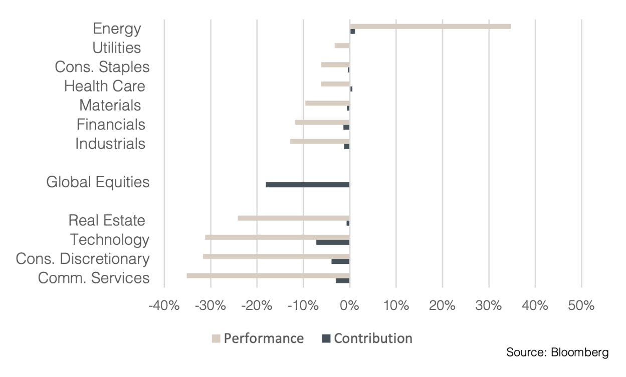 Rising interest rates also set the tone for equities last year, marking a fundamental change or regime shift. Years of zero interest rate policy and increasingly aggressive investors were supported by a massive increase in liquidity. Over the past few years, this fueled fast-growing sectors like technology, communications, and consumer cyclicals. With the technology sector making up nearly a quarter of global equity capitalization at the beginning of the year, the most interest rate-sensitive part of the equity market came under heavy pressure. Around 40% of last year's losses can be attributed to the technology sector. When adding the cyclical consumer goods and communications sectors, these weakest areas accounted for roughly 80% of the negative total equity market returns in 2022. Very similar to 2021, 30% of global equity returns came from just six US companies (Alphabet, Apple, Meta, Microsoft, Nvidia, Tesla), but with a negative contribution this time. The energy sector, on the other hand, saw massive gains of nearly 35%, but as it represents only about 3% of global market capitalization, it contributed just 1.1% to global equity returns.