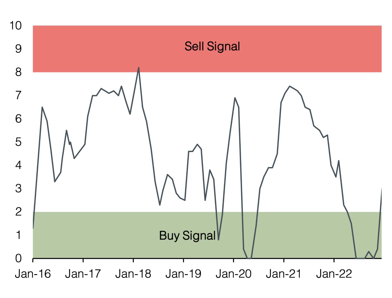 We started the year with a neutral equity positioning and remained neutral until mid-December. Like many investors, we were caught off guard at the beginning of the year by the outbreak of war in Eastern Europe. The resulting bottlenecks in global supply chains and the surge in inflation led to a shift towards a more defensive equity allocation. By the end of the year, we implemented an equity underweight, driven by very low equity risk premiums and improved sentiment as indicated by our contrarian risk index.
