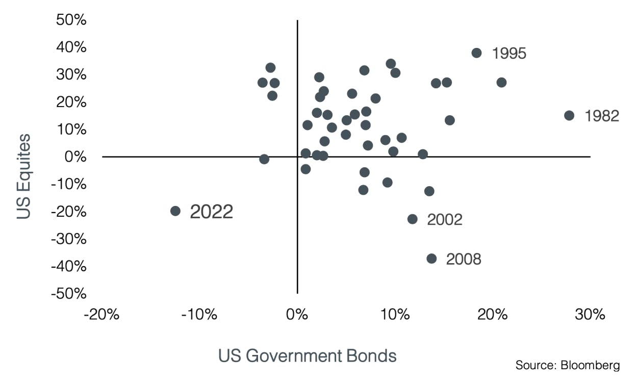 A look at the two major investment categories, equities and bonds, shows just how extraordinary investment returns were in 2022. Never in the last 50 years has there been a year in which both areas suffered comparably. Historically, government bonds have served as a safe haven when stock markets were in turmoil. As shown in the chart below, the dotcom bubble (2002) and the global financial crisis (2008) are good examples of the usually negative correlation of equities and bonds.