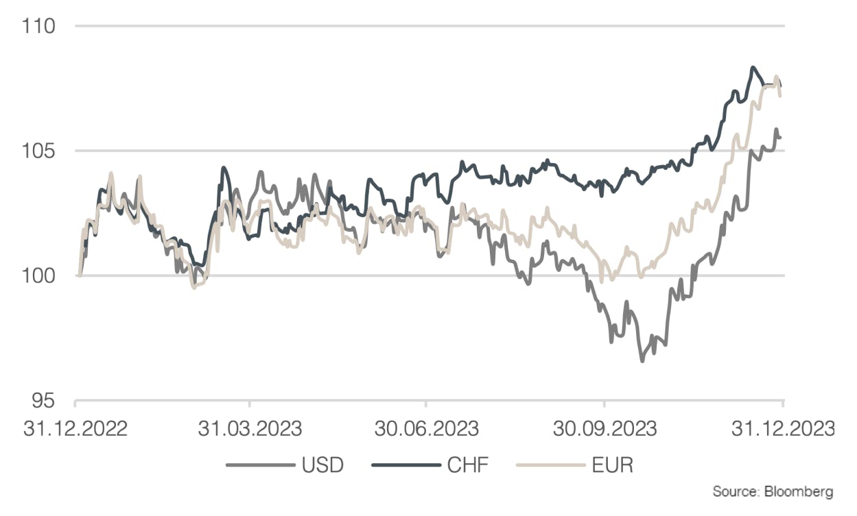 What proved to be a good strategy by year-end required a lot of nerves throughout the year. With the exception of CHF bonds, which already reached their interest rate peak in 2022, USD bonds specifically experienced losses due to the unexpectedly strong increase in interest rates until October. The chart below highlights that the majority of gains in the main bond markets were achieved towards the end of the year. This was primarily attributed to the Federal Reserve, which used the last meeting of the year to signal for the first time since the beginning of monetary policy tightening that the fight against inflation was succeeding. Hence, even the central banks communicated that no further interest rate hikes were needed.