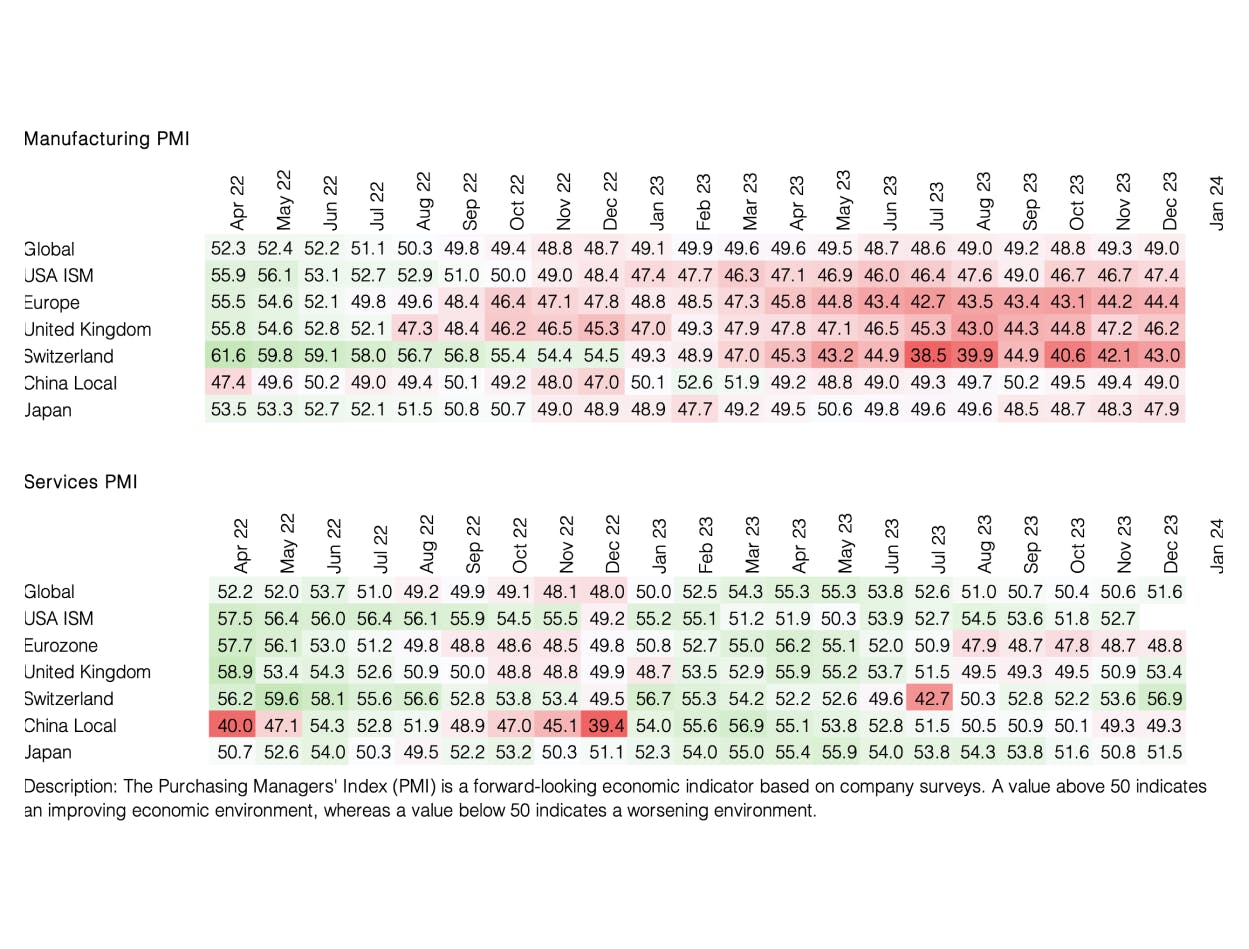 By year-end, the conviction emerged that central banks had completed their interest rate tightening cycle and that it was only a matter of time before the first interest rate cuts in USD, EUR, and CHF would be implemented. Hence, expectations for monetary policy easing in 2024 are high, with the consensus anticipating gradually lower interest rates, a further weakening of inflation, and simultaneously higher corporate profits.