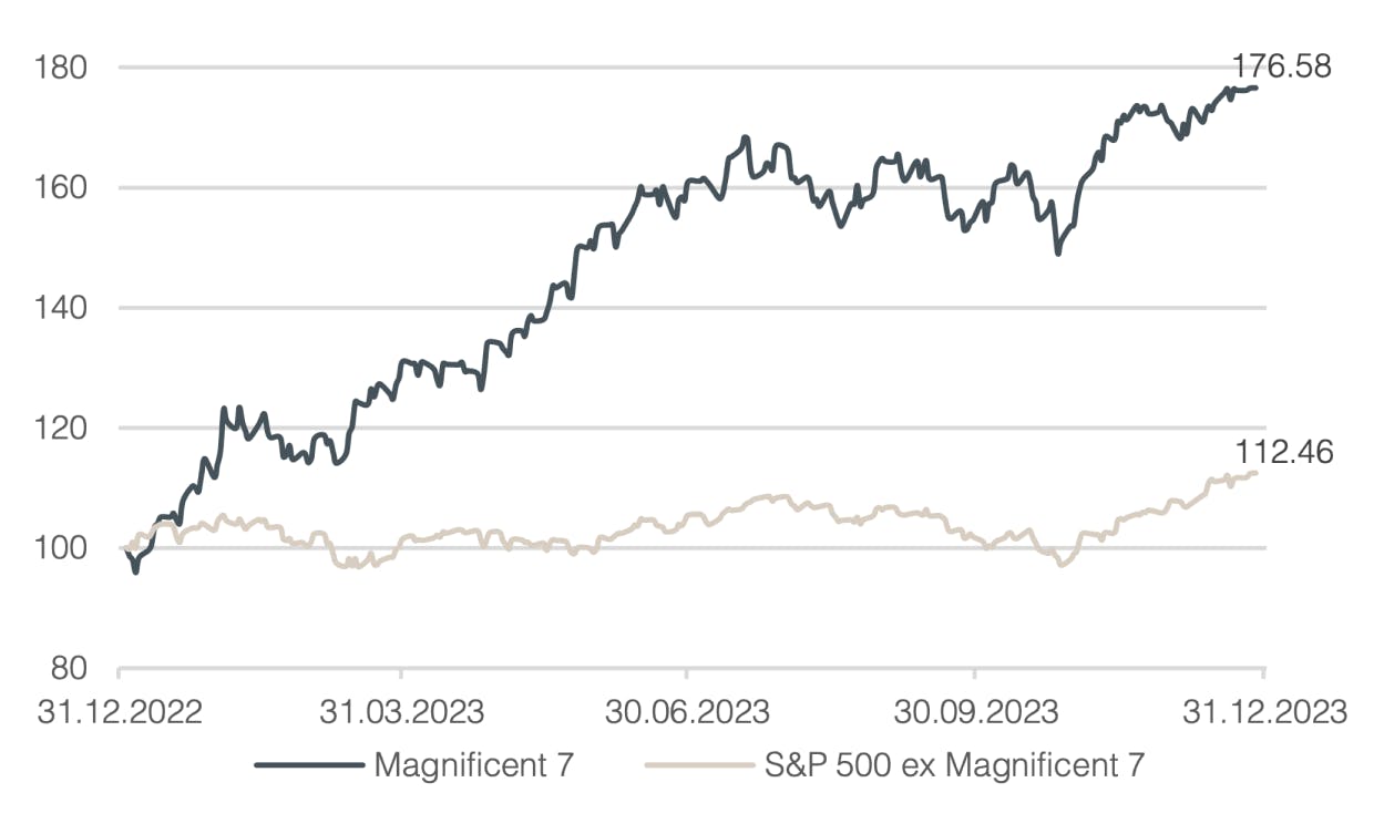 In the past two years, we have repeatedly reported that the development of global stock markets was significantly driven by a handful of US technology stocks. In 2023, the same companies once again drove the overall market. It is noteworthy that the dominance of these seven leading companies (Alphabet, Amazon, Apple, Meta, Microsoft, NVIDIA, and Tesla) has even increased, creating market distortions that deserve our attention.
