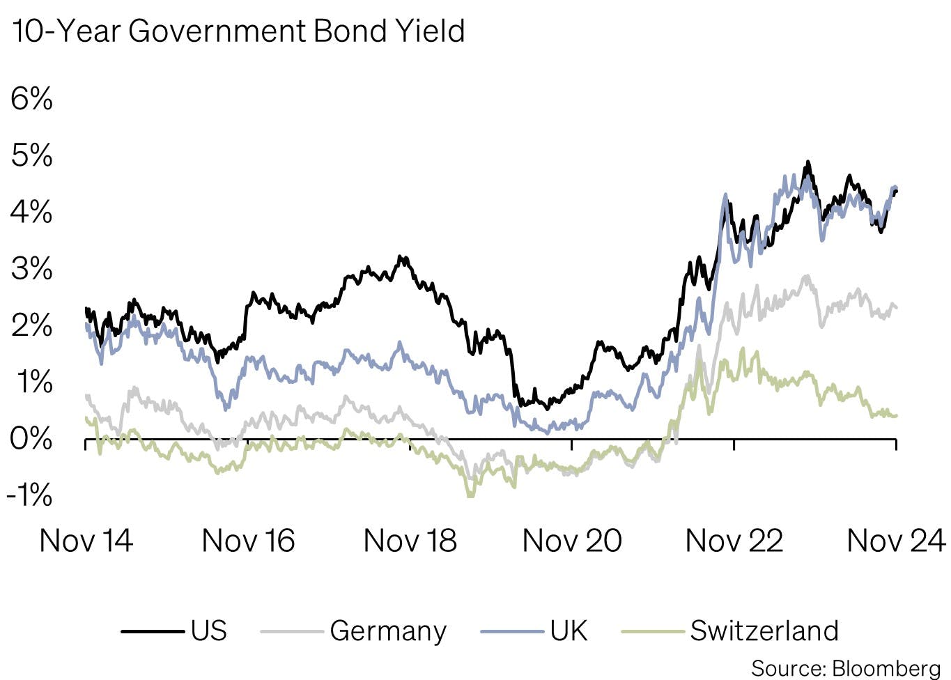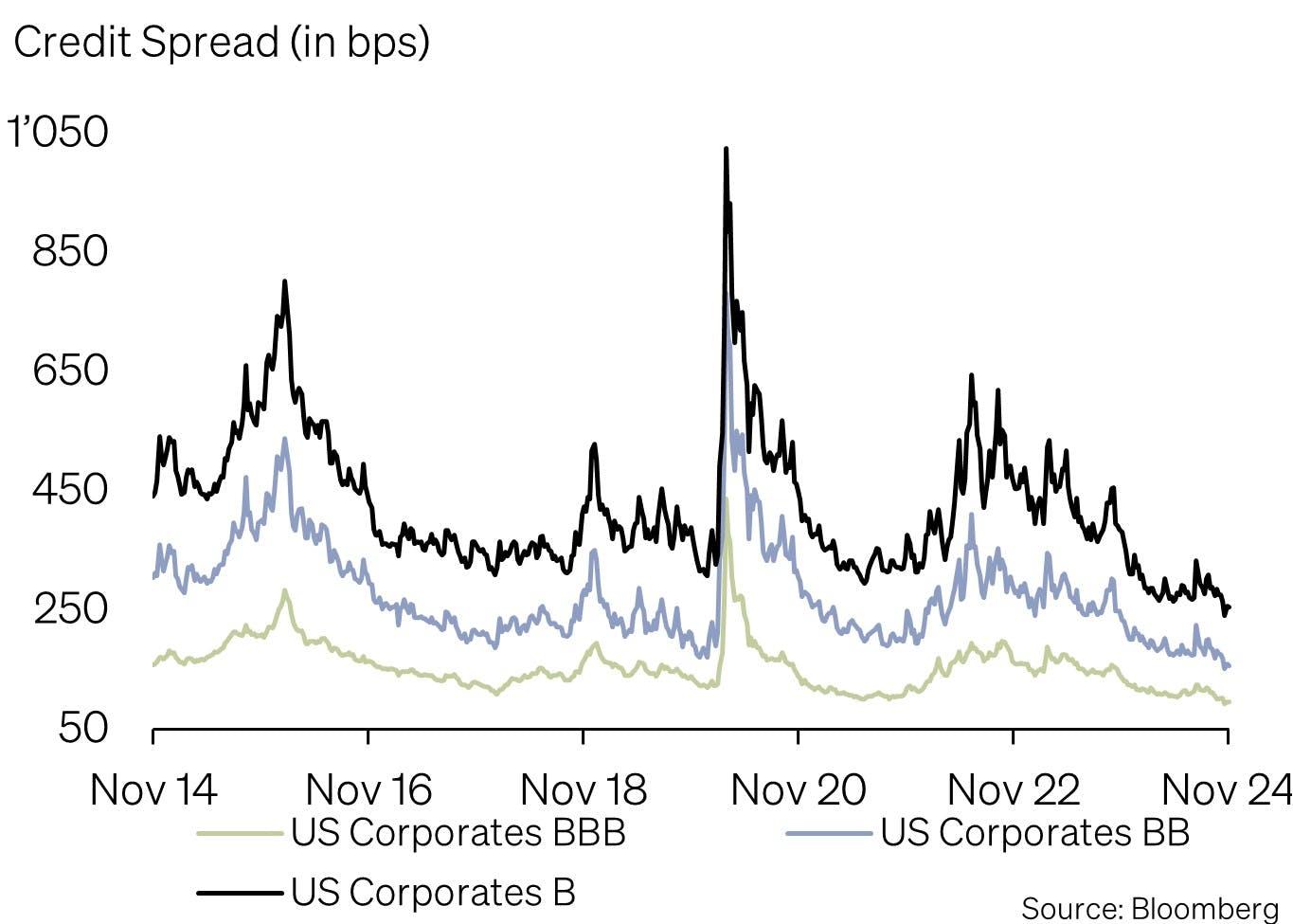 Given current high valuations and ambitious earnings expectations for 2025, we maintain a neutral stance on equities. In light of the subdued outlook for the consumer staples sector this earnings season, we are reducing our overweight in the sector to a neutral position. In fixed income, we continue to avoid credit risk, as risk premiums have fallen to record lows following the U.S. elections.