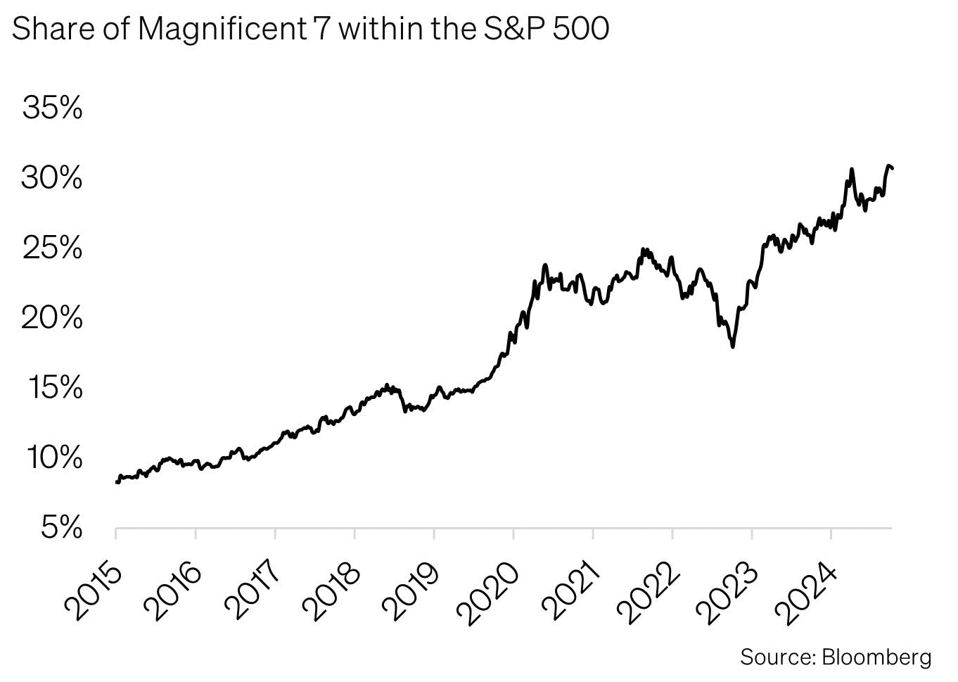 One ongoing concern is the rising concentration in major indexes. The ten largest stocks in the S&P 500 now represent around 38% of the entire index, significantly distorting market breadth. However, 2025 could be the year when the “Magnificent Seven” no longer drive earnings growth alone. Broader-based earnings are anticipated, which may help improve market breadth.