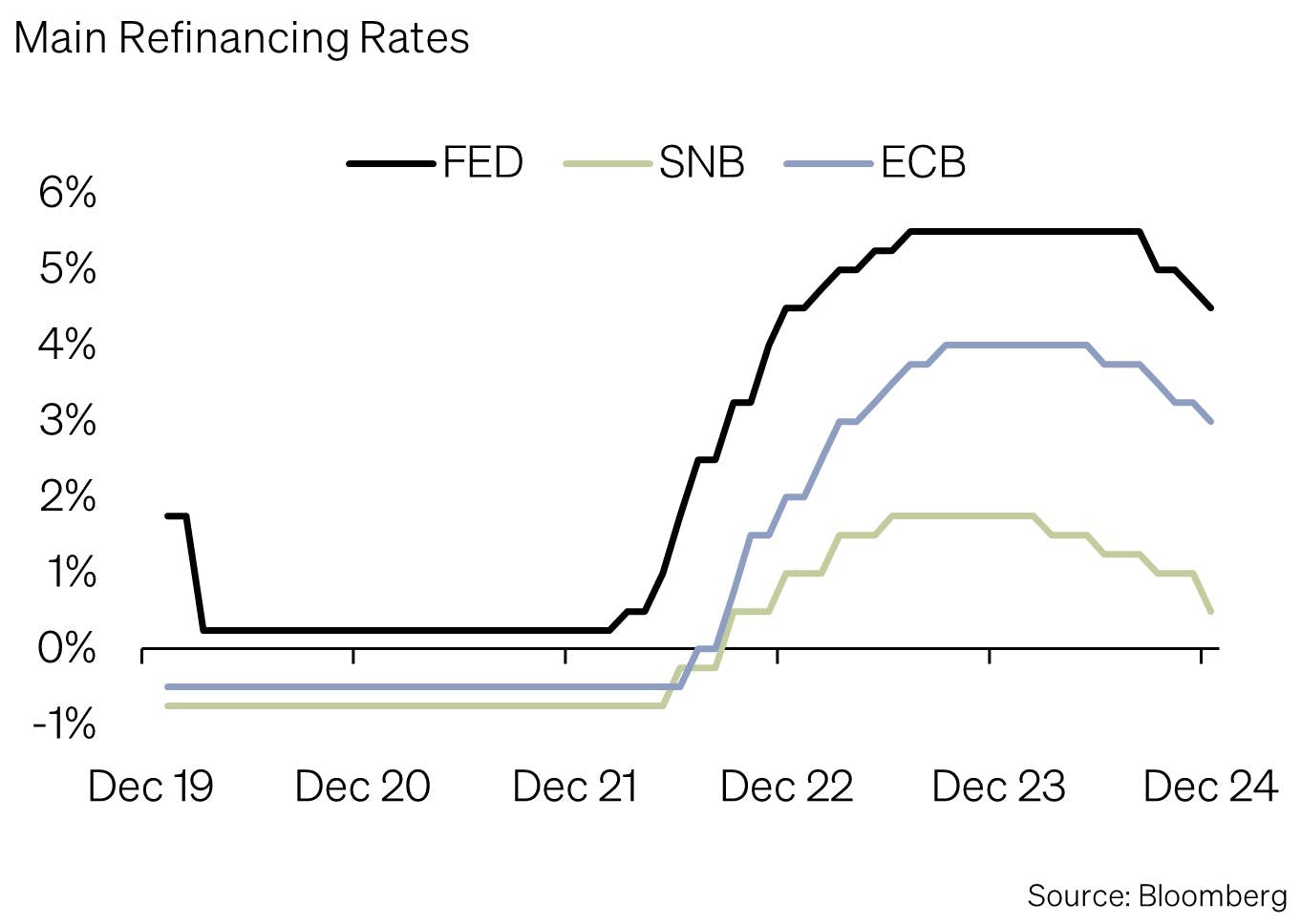 Another milestone of the year was the long-awaited shift in central bank interest-rate policies. The Swiss National Bank (SNB) lowered its rates in four increments, amounting to a surprising 1.25% reduction. Meanwhile, the European Central Bank (ECB) also cut its key rates in four steps by 1%. In the United States, the Federal Reserve (Fed) lowered rates in three steps, totaling a 1% reduction. These monetary policy easing measures provided the markets with tangible support and gave a positive boost to economic growth.