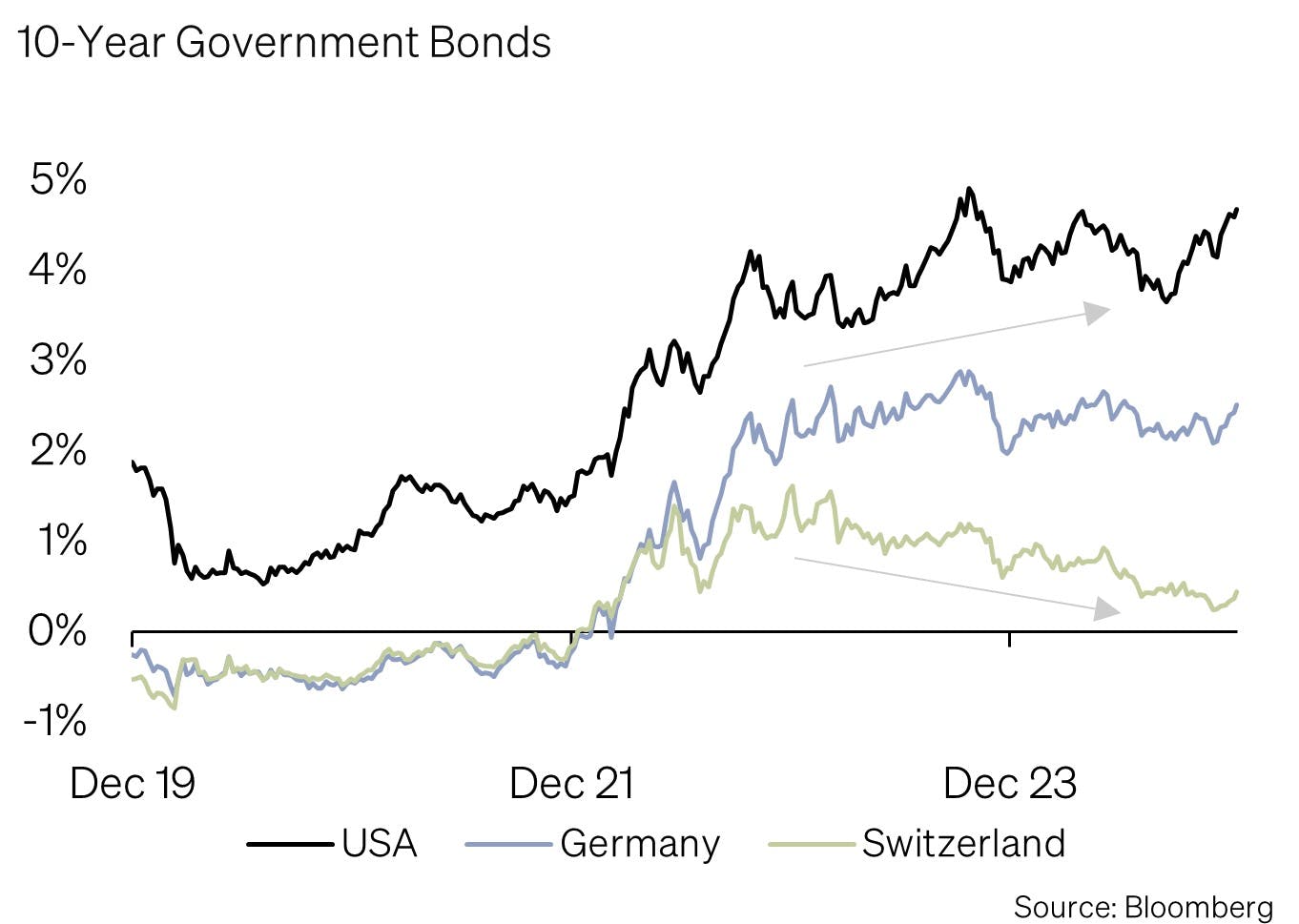 In contrast, the Federal Reserve (Fed) remained more cautious considering persistently high inflation. While markets had priced in six rate cuts for 2024 as of December 2023, only four materialized. This restraint caused yields on 10-year U.S. Treasuries to rise in 2024 despite falling short-term rates. Nevertheless, given their already high coupon rates of over 4%, U.S. bonds still posted slightly positive total returns.