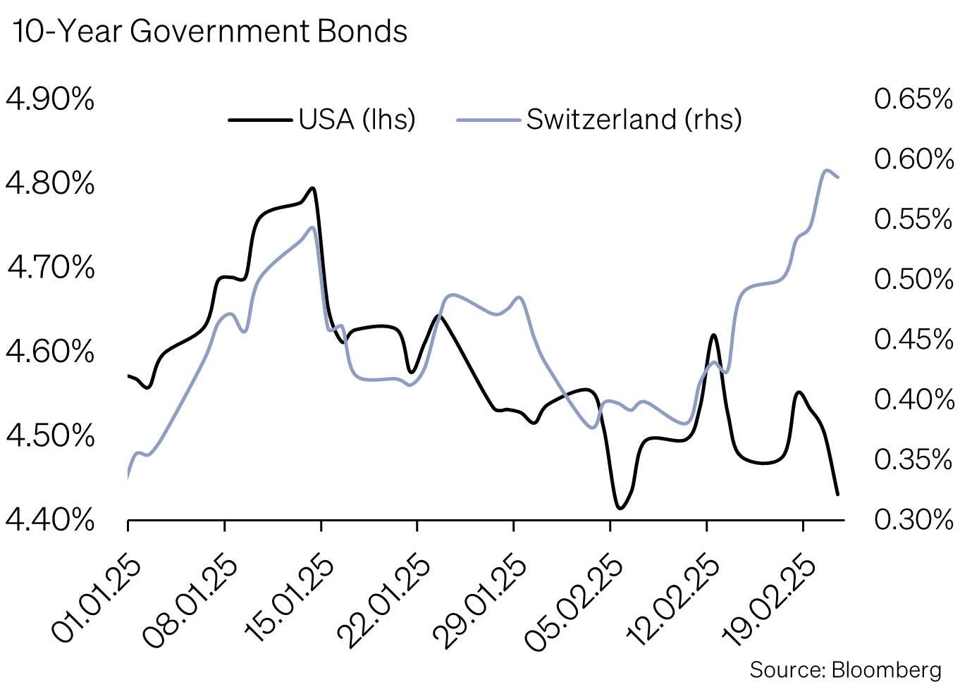 While the Fed is taking a wait-and-see approach due to inflation concerns, the European Central Bank remains on a rate-cutting path, with three additional rate cuts expected this year. Similarly, the Swiss National Bank is likely to cut rates in March. In Switzerland, price action in the fixed income market caught our attention. The yield on 10-year government bonds jumped from 0.2% in December to 0.57% currently, as last year’s fears of negative interest rates vanished.