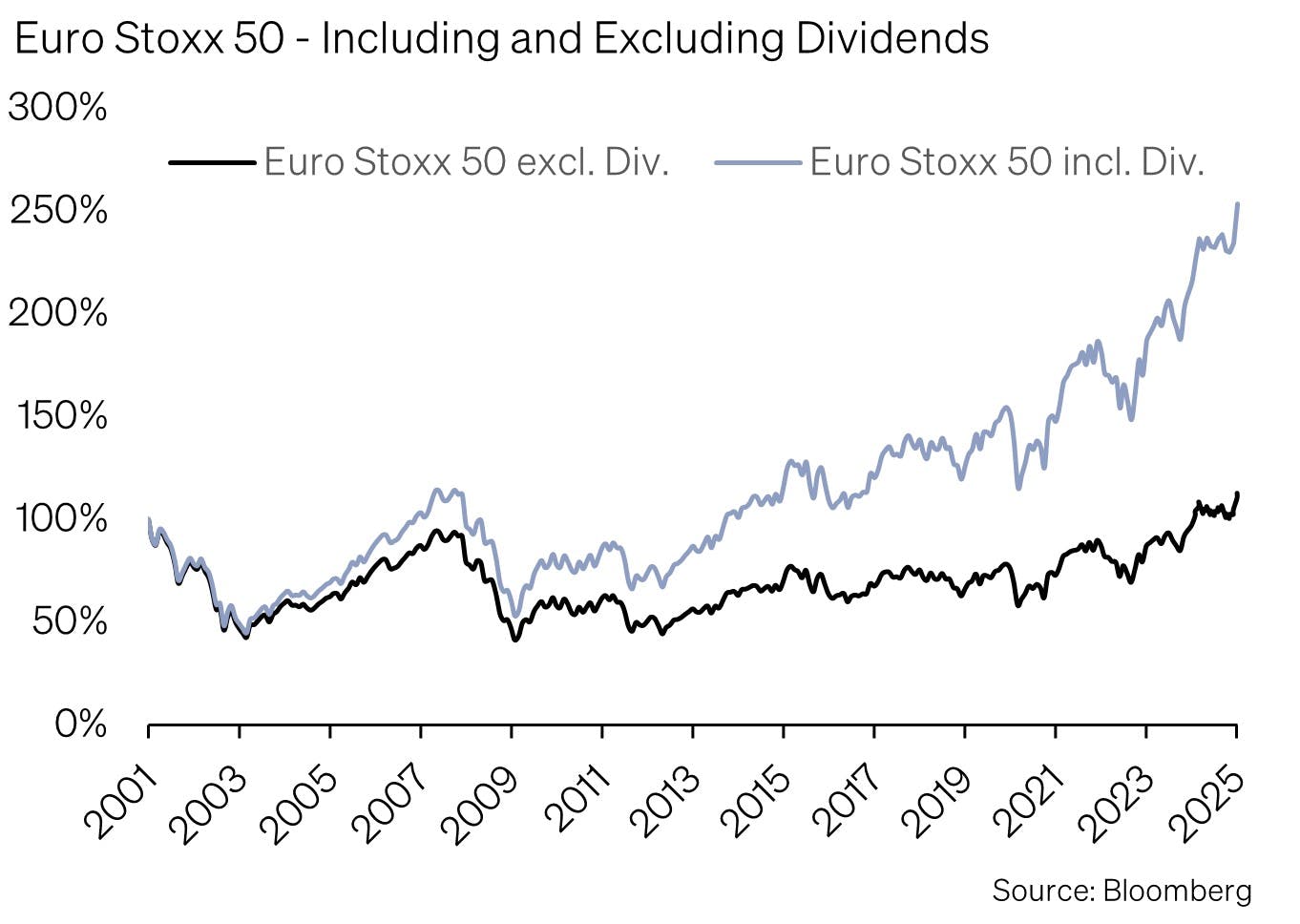 A surprising trend since the beginning of the year has been the strong performance of European equities. While U.S. stocks have lagged global markets, the Euro Stoxx 50 finally reached a new all-time high after 25 years. This move defies expectations, as analysts had largely projected continued U.S. market leadership in 2025. The following chart highlights the crucial role of dividends in long-term investing. While the index remains at levels similar to those of 2000, investors who reinvested their dividends have more than doubled their capital.