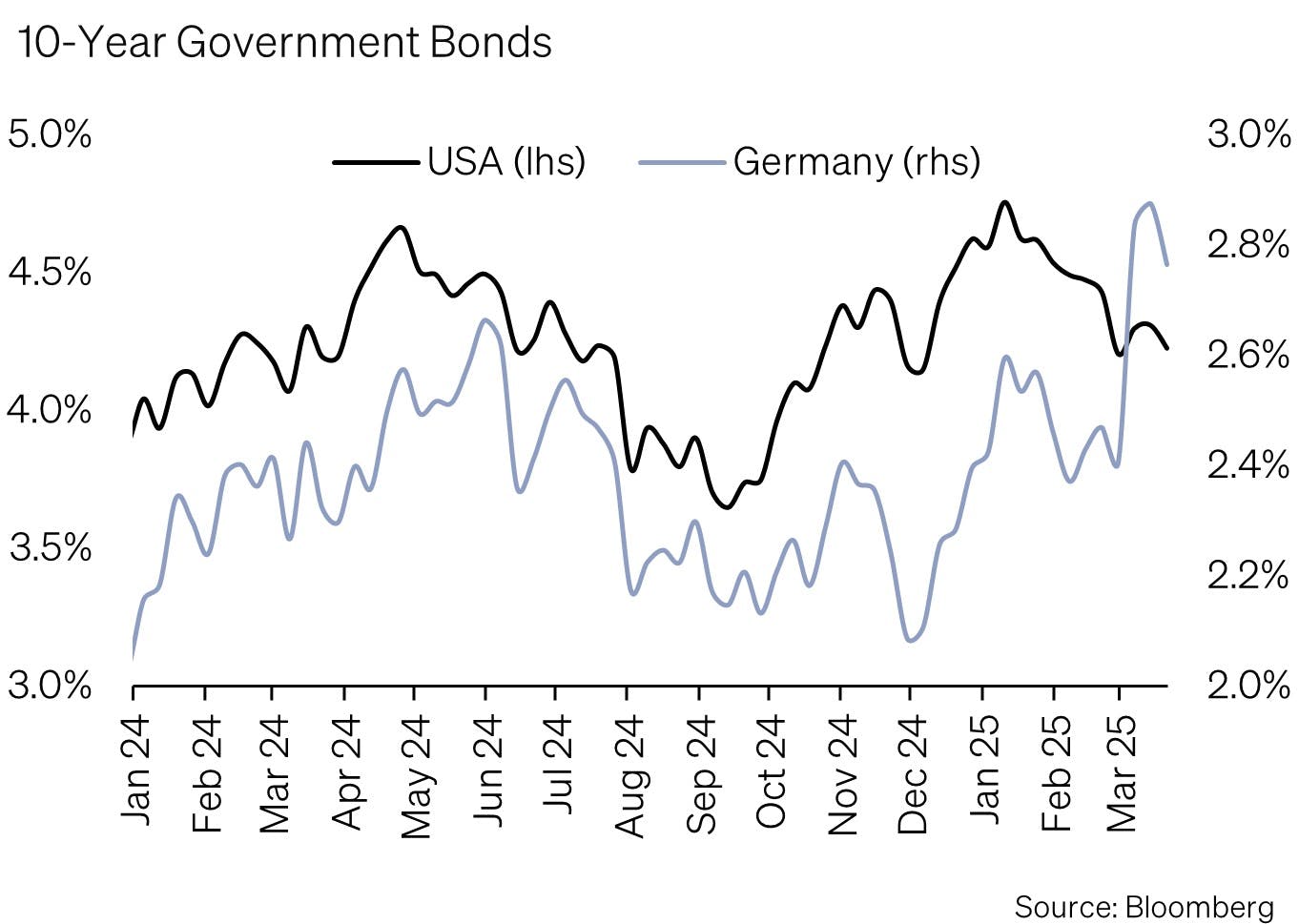 In Germany, the announced investment package and resulting debt increase have triggered a substantial rise in the yields of ten-year government bonds—the sharpest since the 1990s. Similar, though less pronounced, trends emerged in other Eurozone countries. In contrast, Switzerland reduced its benchmark interest rate further to weaken the Swiss Franc, thereby making CHF bonds increasingly unattractive.
