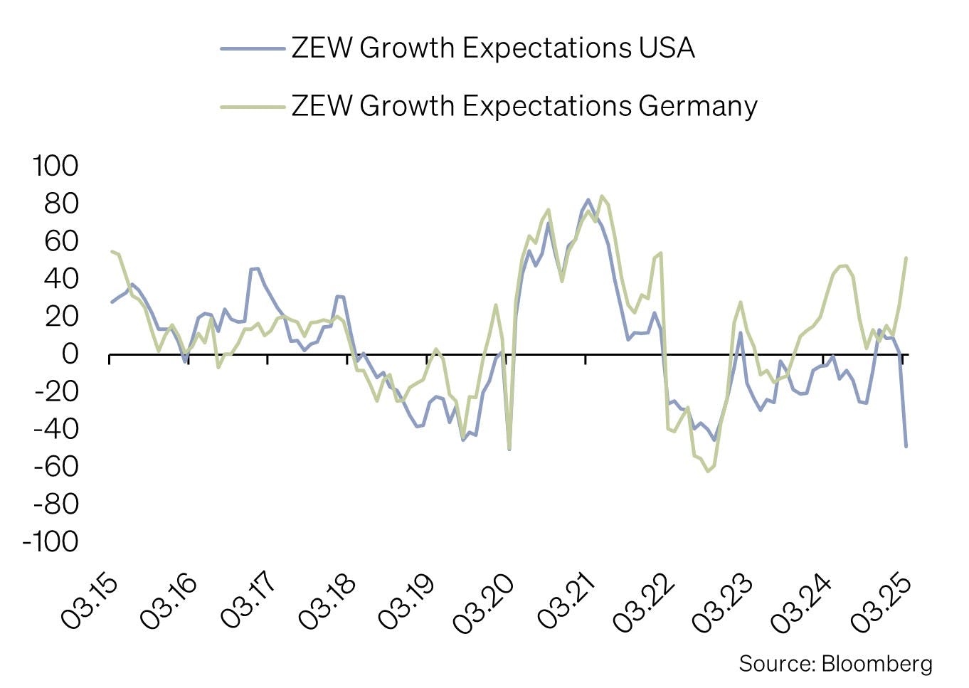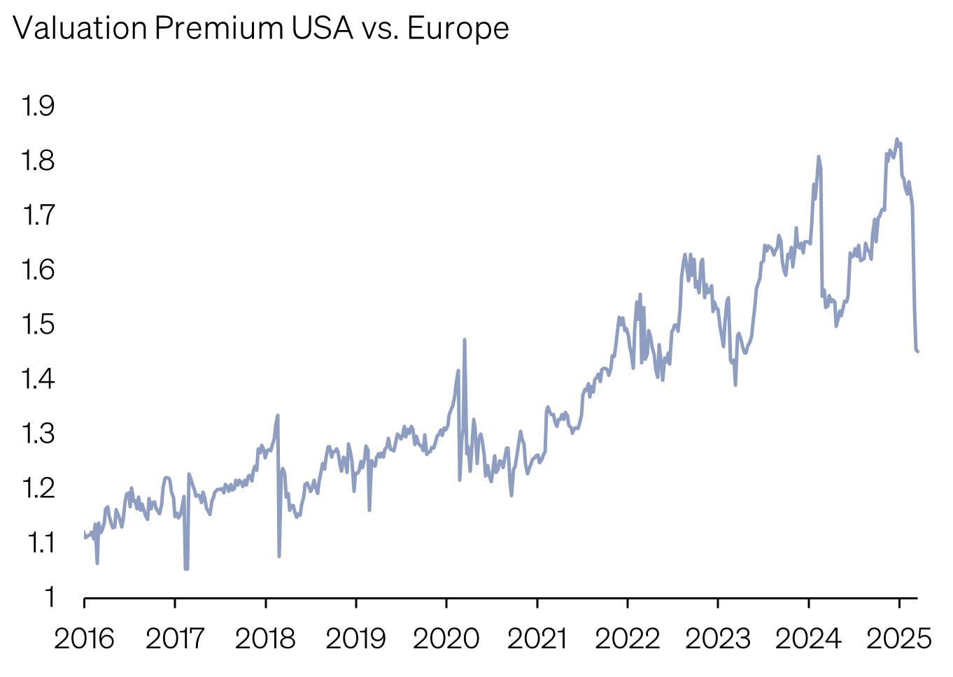 Recent market movements have notably narrowed the valuation premium (price/earnings ratio) of US stocks compared to Europe, reflecting improved growth expectations for Europe and diminished expectations for the US. However, US economic growth is expected to remain stronger in the short term, continuing to justify a valuation premium.