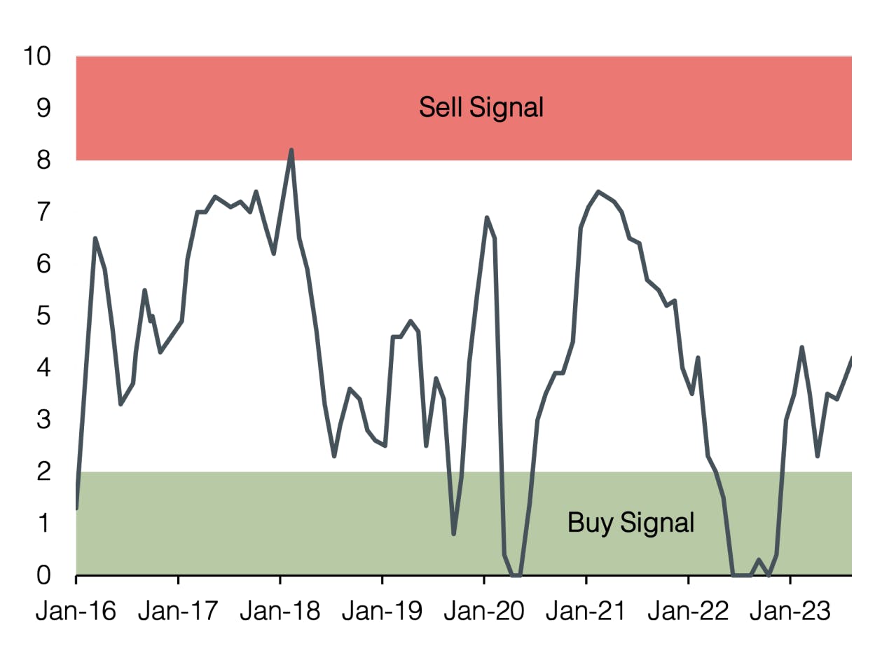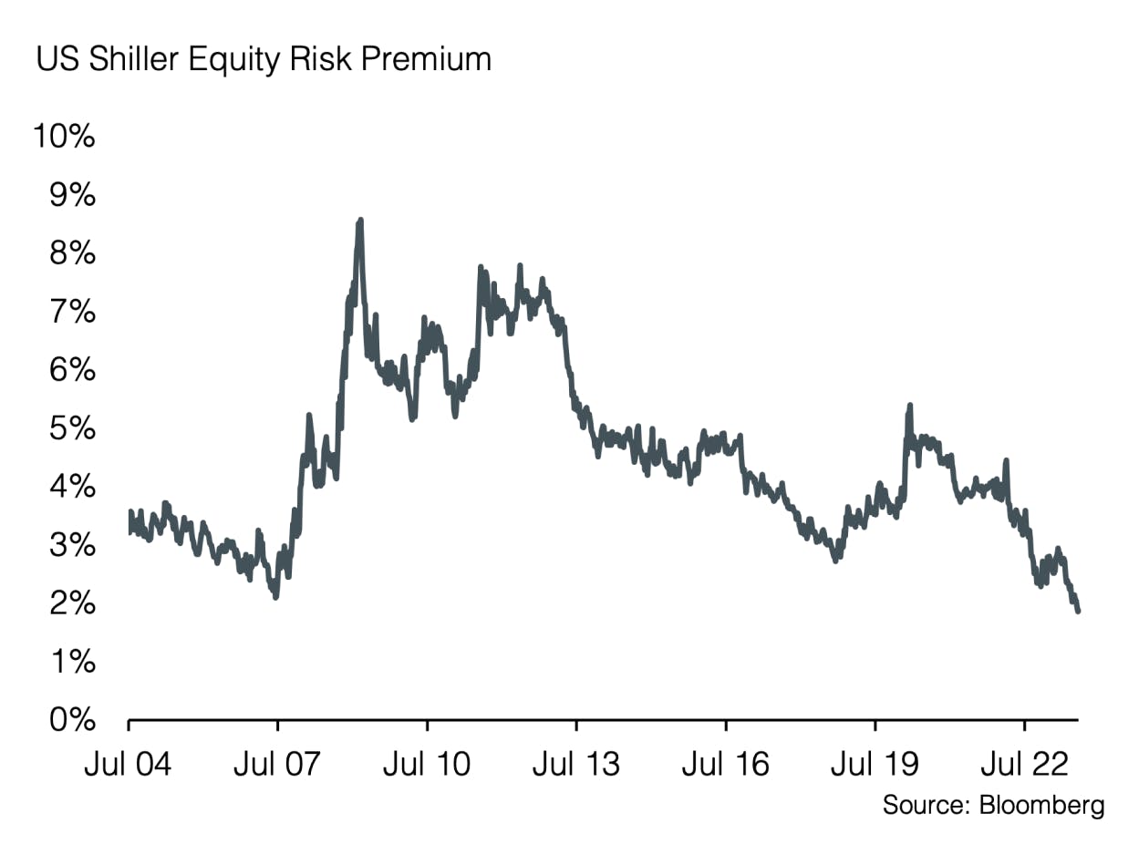 In contrast to the past two months, fixed income market development is now leaving negative traces on stock markets as well. The equity markets are experiencing their weakest month since September 2022. Although recently released US economic data showed a strong increase in demand for durable goods, one-off effects in the aerospace sector have been the main driver, diluting the overall data set. Retail sales have also pleasantly surprised, and the labor market remains very robust. Due to higher real interest rates, the equity market risk premium has fallen even further, remaining the primary argument for a limited return potential going forward. The Chinese stock market is causing the greatest concerns for now. Chinese equities have underperformed for some time, and negative headlines are emerging continuously.