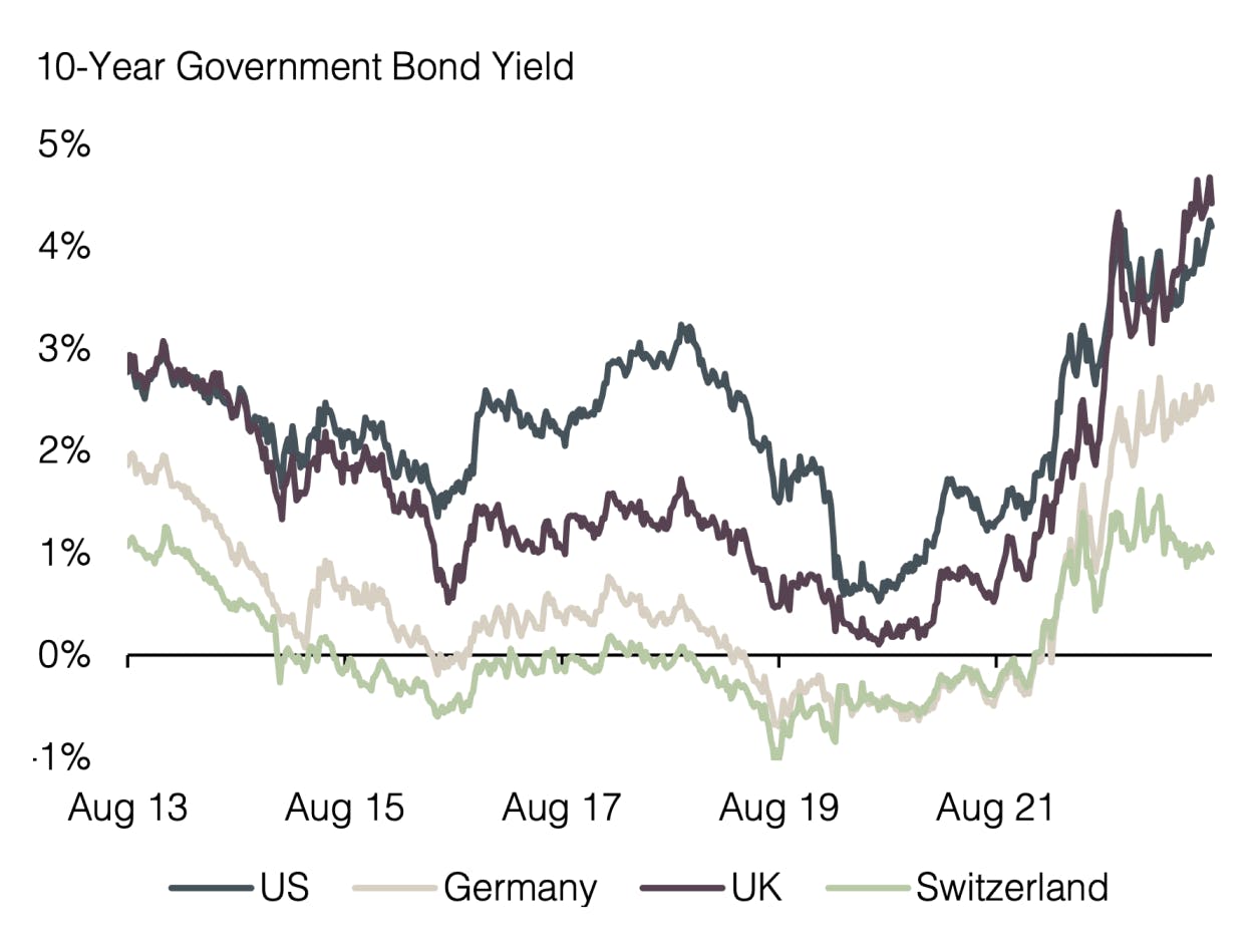The latest interest rate hikes by the Federal Reserve and the European Central Bank of 0.25% each came as no surprise. However, it’s worth highlighting that the outlook for future monetary policy has remained restrictive. Nonetheless, market participants anticipate that the current interest rate cycle is completed. However, the increase in long-term interest rates also reflects that the market had anticipated lower rates prematurely, a trend that has been evident throughout the current year. Consequently, fewer interest rate cuts for the year 2024 are now being priced in.