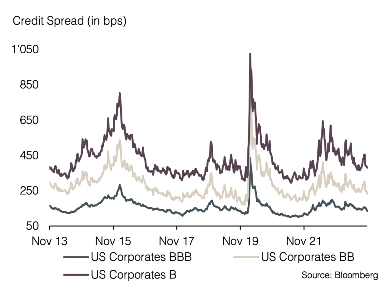 Consequently, investors now see central banks approaching the home stretch, with no further interest rate hikes expected in the current cycle. The focus is now shifting towards the first interest rate cuts, expected as early as May 2024. However, a sudden change in direction with regards to monetary policy is not on the menu for central bank officials. "My colleagues and I are pleased with the progress, but we expect that the process of sustainably lowering inflation to 2 percent is far from complete," said Jerome Powell at the beginning of the month. The positive development regarding inflation led to strong gains in both bond and equity markets. Due to significantly lower interest rates and a drop in inflation expectations, global bond markets experienced their strongest monthly increase in over 25 years. Equities, meanwhile, recorded the biggest monthly gain in three years. Unlike the earlier part of the year, gains in the equity space were broadly supported across sectors and styles and not solely carried by a few large companies.